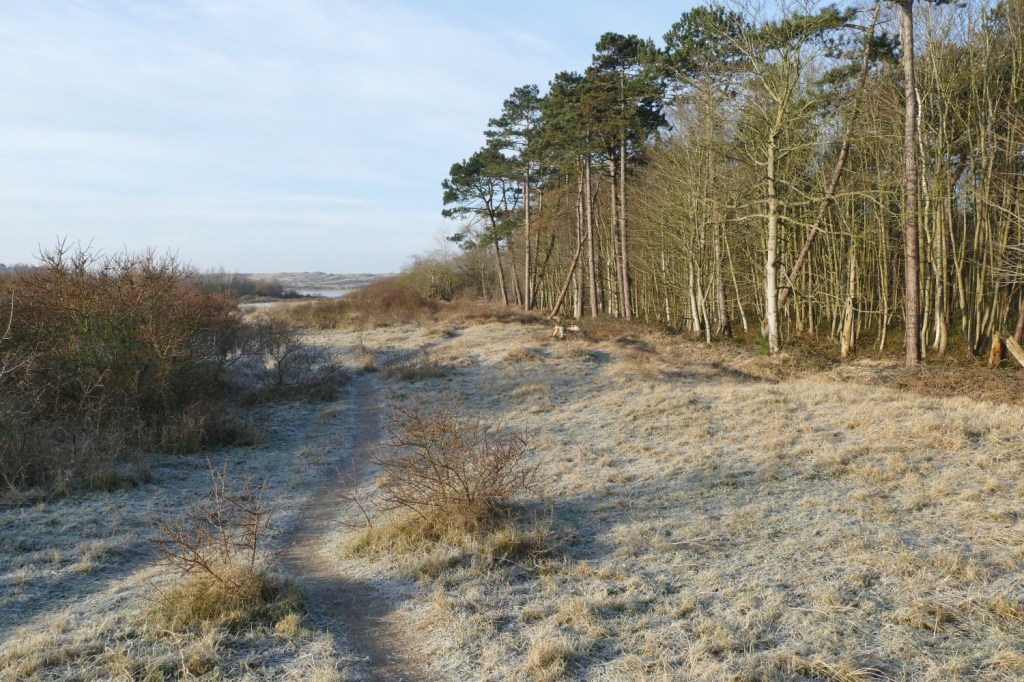 We beginnen met het paadje langs de Kleimeer. De eerste meters soppen we over zompige bodem, vervolgens glibberen we over het spekgladde pad. De Kleimeer ligt er rustig bij… Wel zijn er opvallend veel ganzen in de lucht, beduidend meer dan de afgelopen twee, drie maanden.
