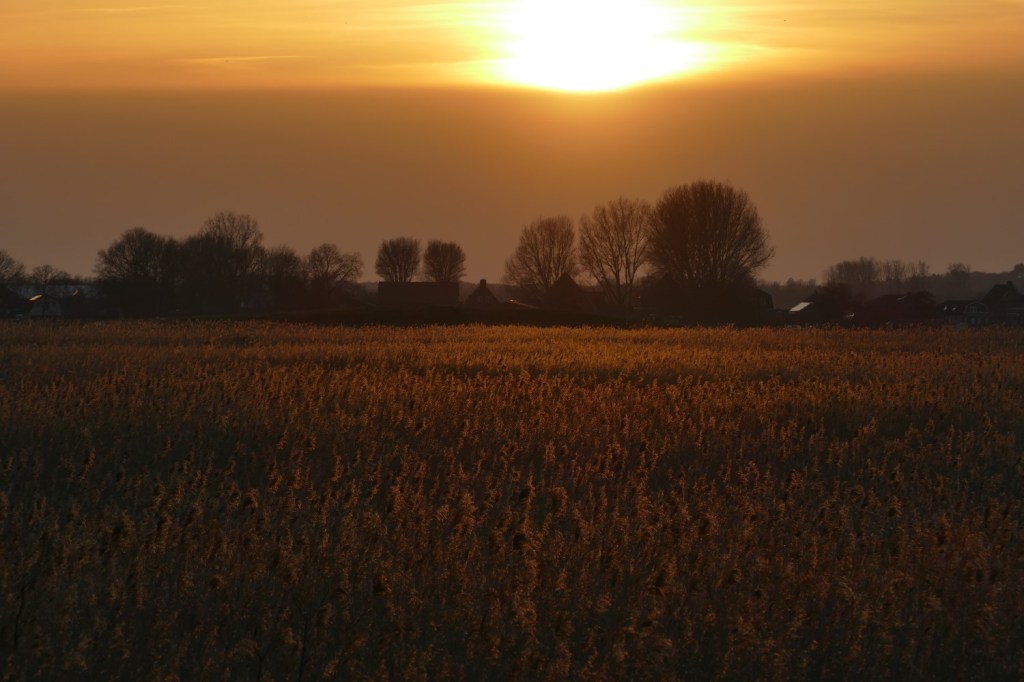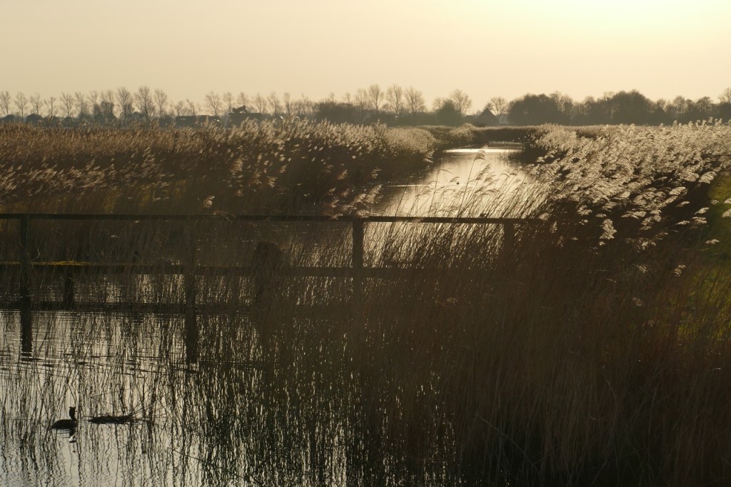 We lopen op ons gemakje over het paadje langs de Kleimeer. Vrijdag was het hier nog aardig glibberig, vandaag is de meeste modder opgedroogd en is het pad prima te belopen – op een paar plekken na… De late namiddagzon werpt een warme gloed over het overjaarse riet… En als de zon verder zakt, wordt elke rietpluim een glinsterend diamantje als je tegen het licht in over de Kleimeer uitkijkt, richting Koedijk.