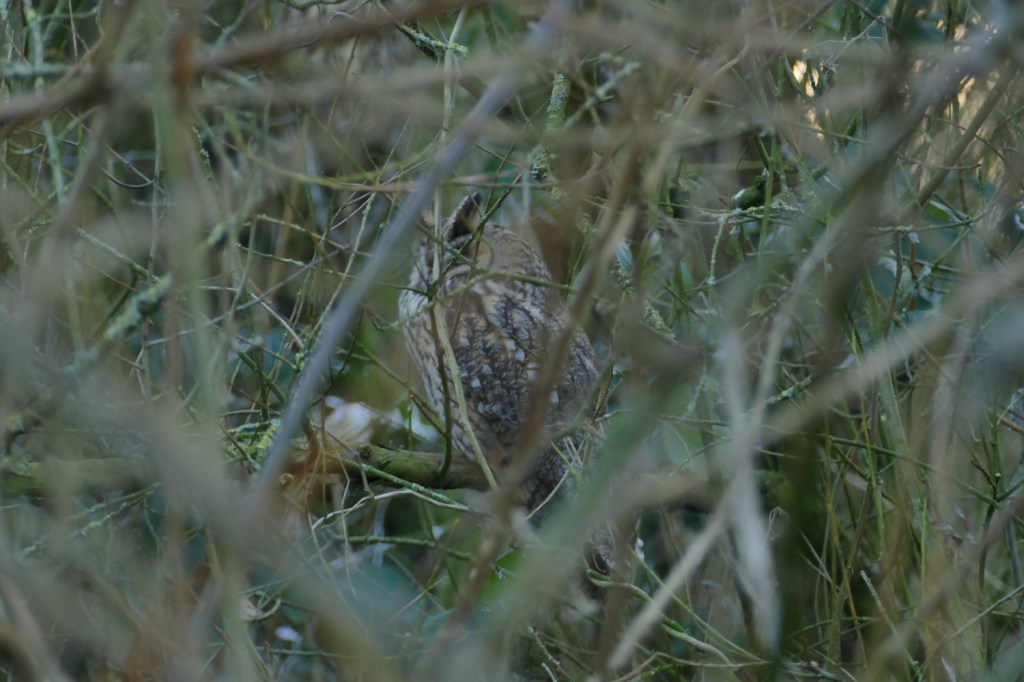 Ter hoogte van het huis verlaten we even de Kleimeer en gaan we kijken of we een ransuil kunnen spotten. In de hoge wilgen aan de rand van de Zomerdel zien we ze niet zitten, maar we treffen er wel een aan in het struikgewas… De foto is niet geweldig, maar toch de moeite waard om te tonen, vind ik.