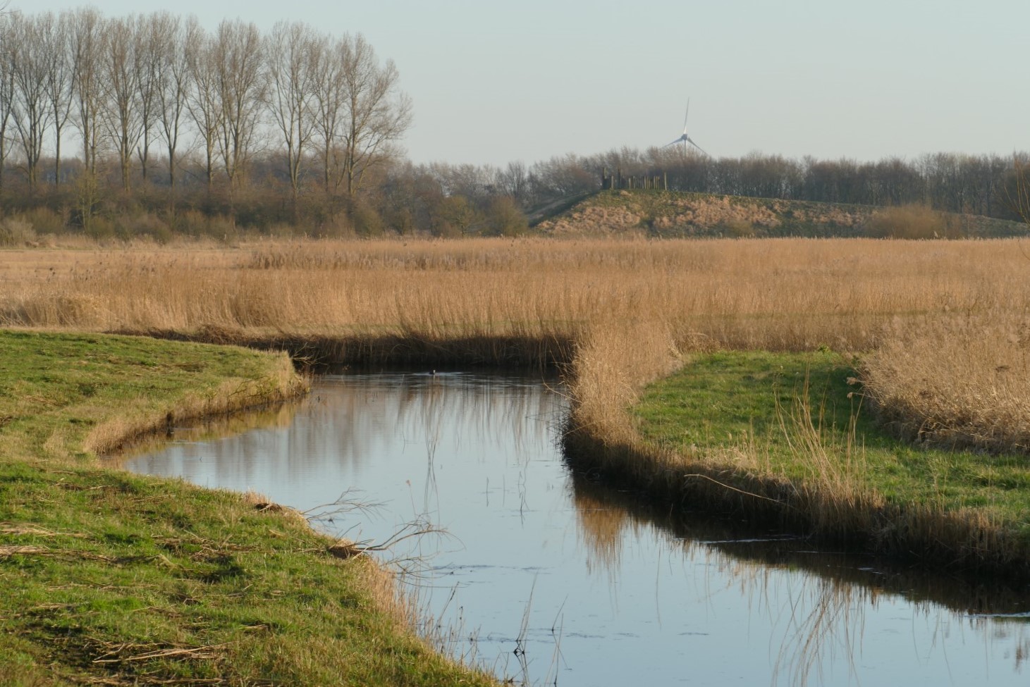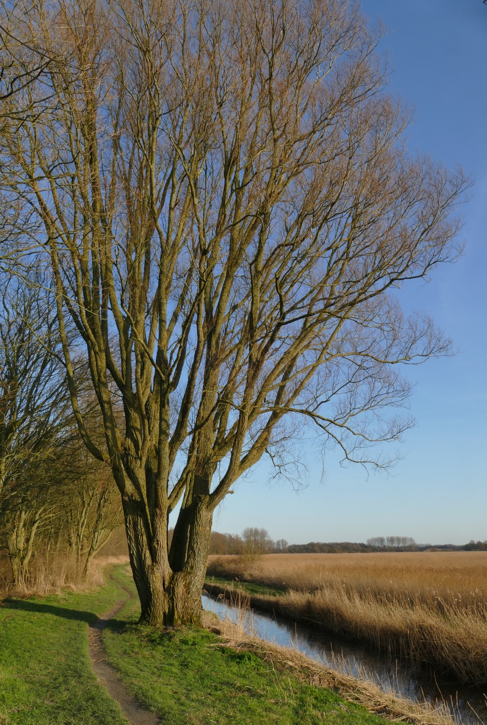We lopen op ons gemakje over het paadje langs de Kleimeer. Vrijdag was het hier nog aardig glibberig, vandaag is de meeste modder opgedroogd en is het pad prima te belopen – op een paar plekken na… De late namiddagzon werpt een warme gloed over het overjaarse riet… En als de zon verder zakt, wordt elke rietpluim een glinsterend diamantje als je tegen het licht in over de Kleimeer uitkijkt, richting Koedijk.
