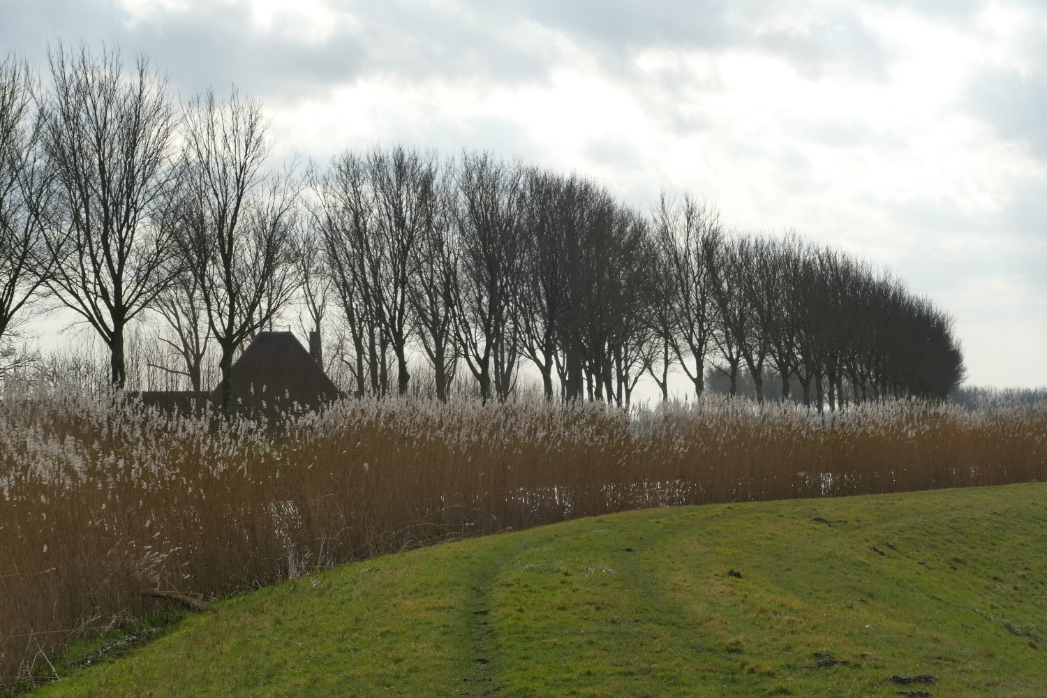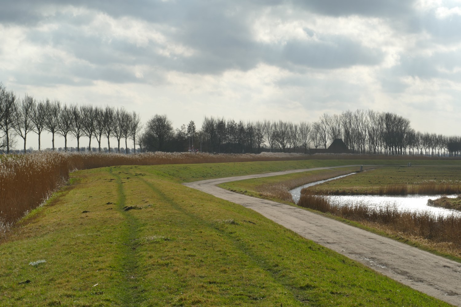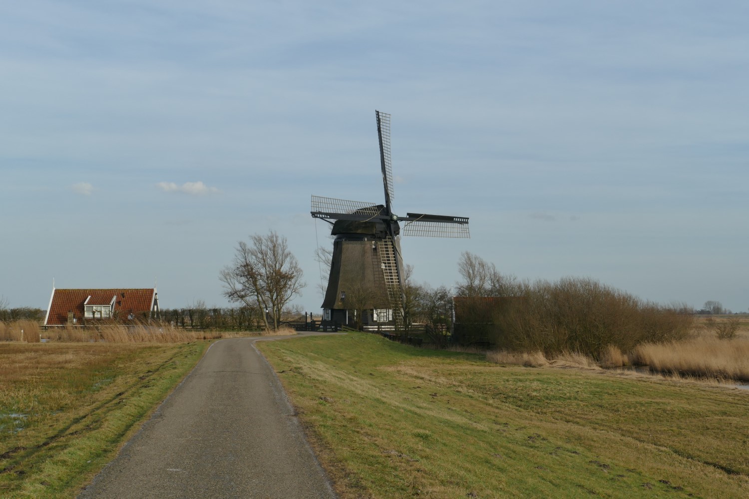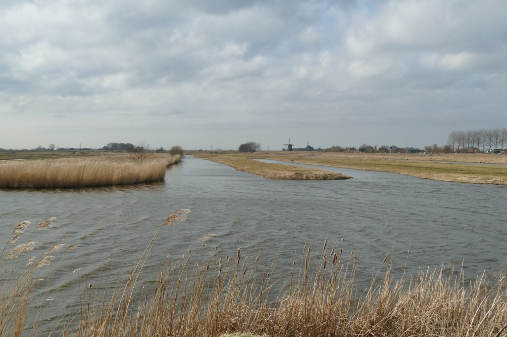 We lopen door de rustige dorpsstraat van Schermerhorn. Bij de kerk gaan we rechtsaf en we komen langs een alleraardigst museumpje: Het Kleinste Huisje van Schermerhorn. We leven nog steeds in tijden van corona, dus het museum is gesloten… We steken de drukke N243 over en lopen het Oostdijkje op. De Westdijk ligt aan de andere kant van de Beemsterringvaart… Het is bewolkt maar af en toe wordt er een scheut zonlicht over het landschap uitgestrooid. Er staat een strakke zuidwester, ik ben blij dat ik een winddichte jas heb aangetrokken! Voorbij de gebouwen van een transportbedrijf ontvouwt zich het open landschap van de Eilandspolder…