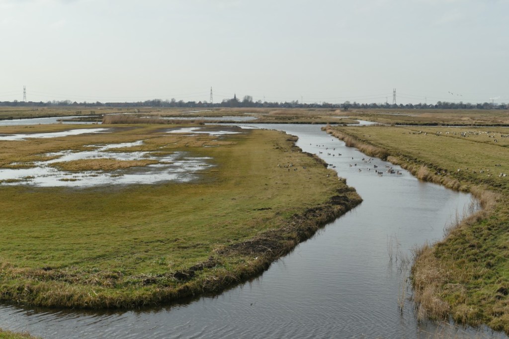 Na ongeveer 4 kilometer vinden we een paaltje met pijltjes van Wandelnetwerk Noord-Holland en ook bordjes van het Noord-Hollandpad, een lange afstandswandelroute van 284 kilometer (hoofdroute) die vertrekt bij de vuurtoren van De Cocksdorp op Texel en eindigt aan de oever van het Gooimeer in Huizen. We verlaten het Oostdijkje en lopen de polder in. Het land is nog behoorlijk drassig maar we zakken er nergens enkeldiep in…