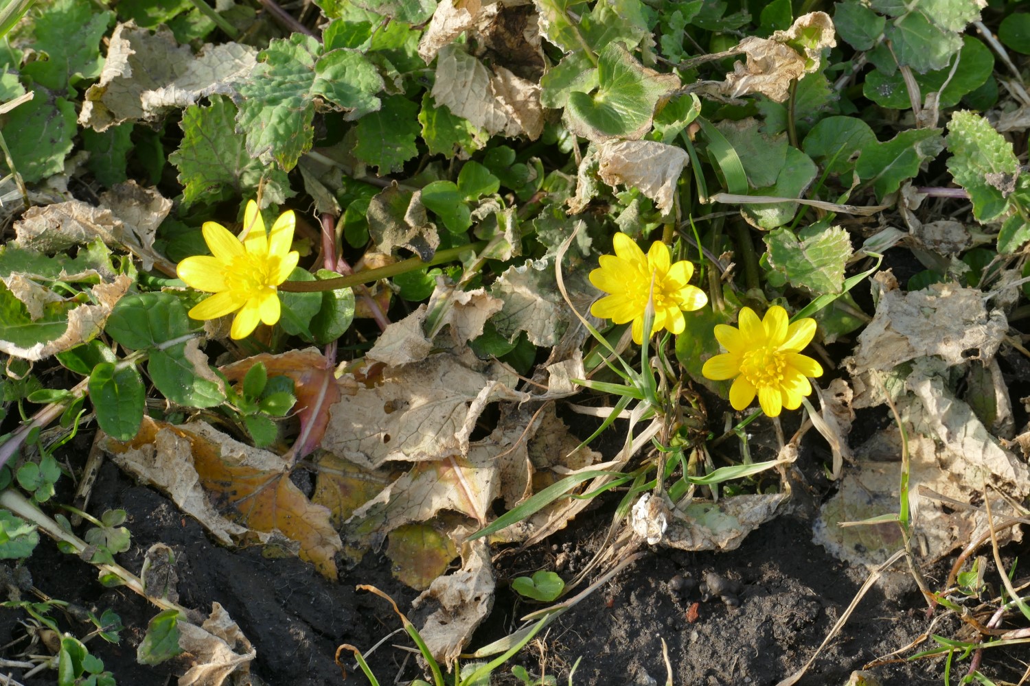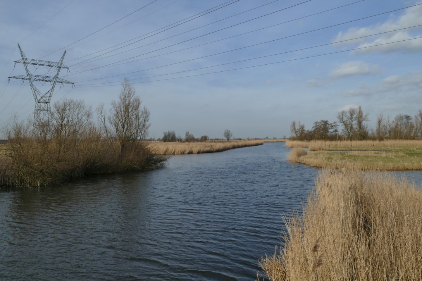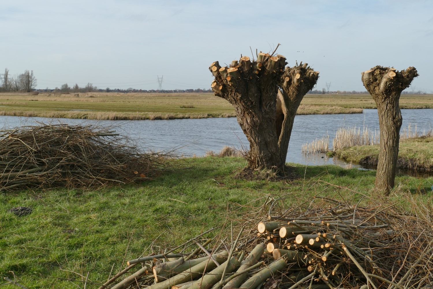 Dwars door de Eilandspolder loopt een hoogspanningsleiding. De route gaat er onderdoor. We komen langs een paar net geknotte wilgen en ik zie het eerste speenkruid van het jaar 2021!