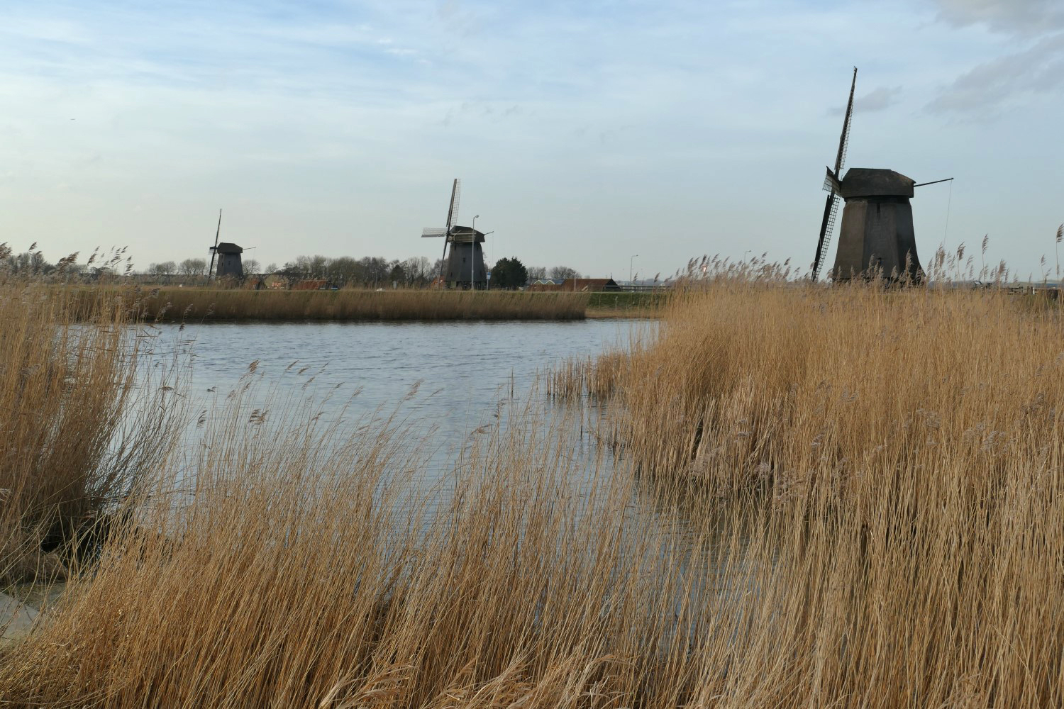Aan de overkant van de Beemsterringvaart strekt zich de Beemster uit. Wat een contrast met de Eilandspolder! Hier een daar steekt het piramidevormige dak van een typisch Noord-Hollandse stolpboerderij boven het wuivend riet uit.