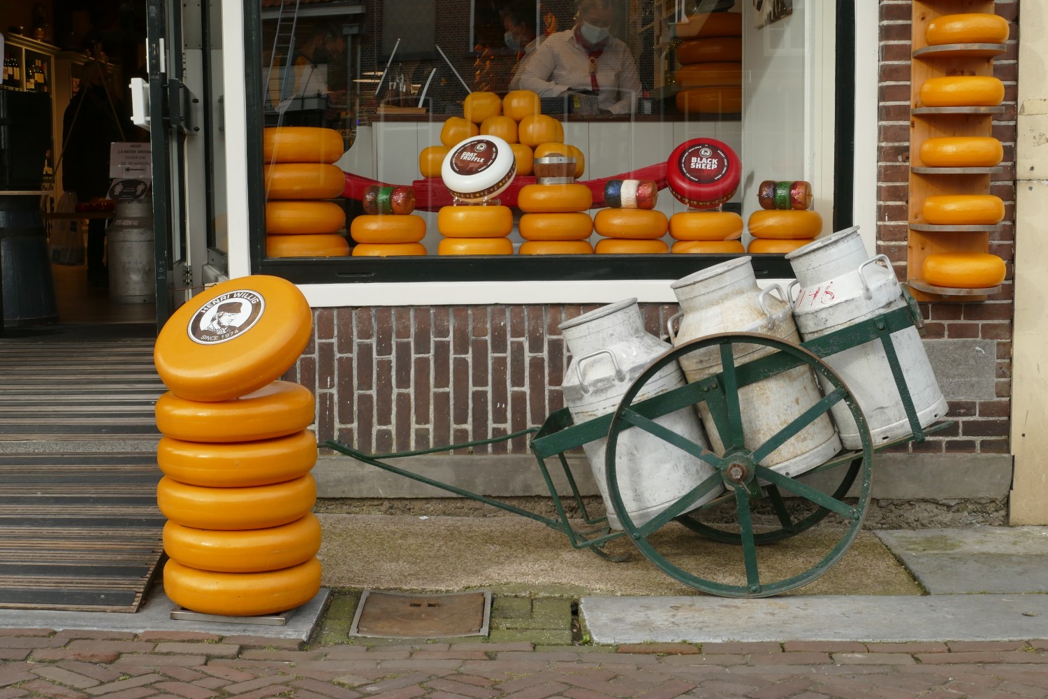 Edam staat uiteraard bekend om zijn kaas die eerder bolvormig is en een stuk kleiner dan de ‘schijven’ kaas uit Gouda… Maar voor de toeristen is Goudse kaas blijkbaar de standaard zoals te zien is bij de kaaswinkel bij de dam. Wie echter goed kijkt, ziet in de etalage een stapeltje heuse Edammers liggen…
