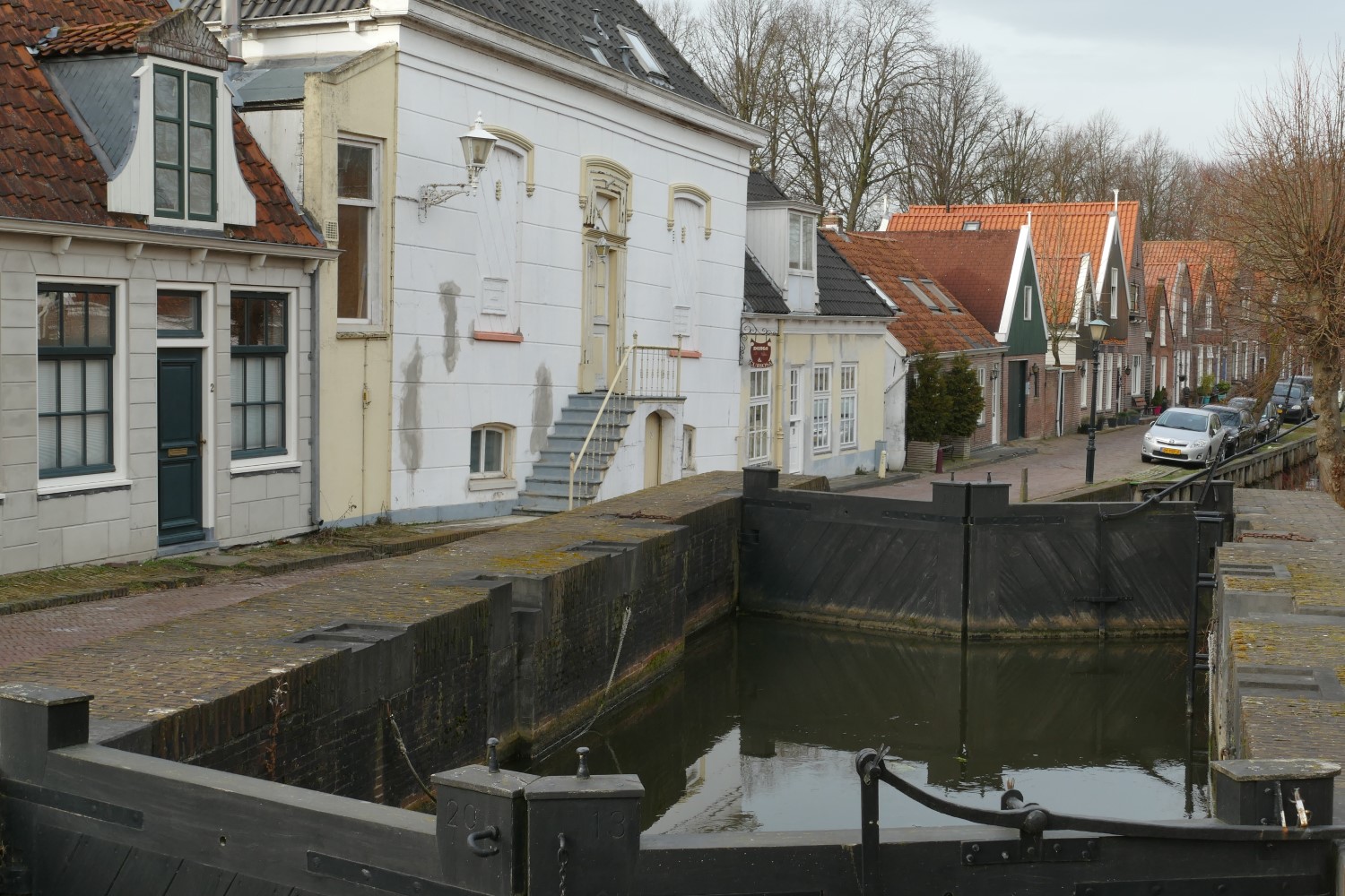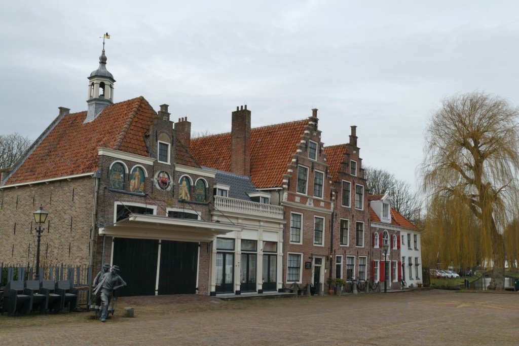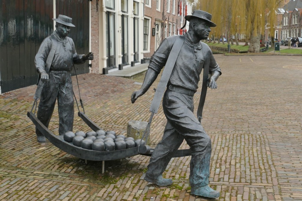 De dam wordt gerestaureerd, er staan hoge hekken omheen en het is niet mogelijk om er een aardige foto van te maken. Natuurlijk zoeken we ook het waaggebouw op, een stuk bescheidener dan de waag van Alkmaar, maar even goed bezienswaardig. Er staat een leuk beeldje van twee kaasdragers met een kaasberrie tussen hen in.