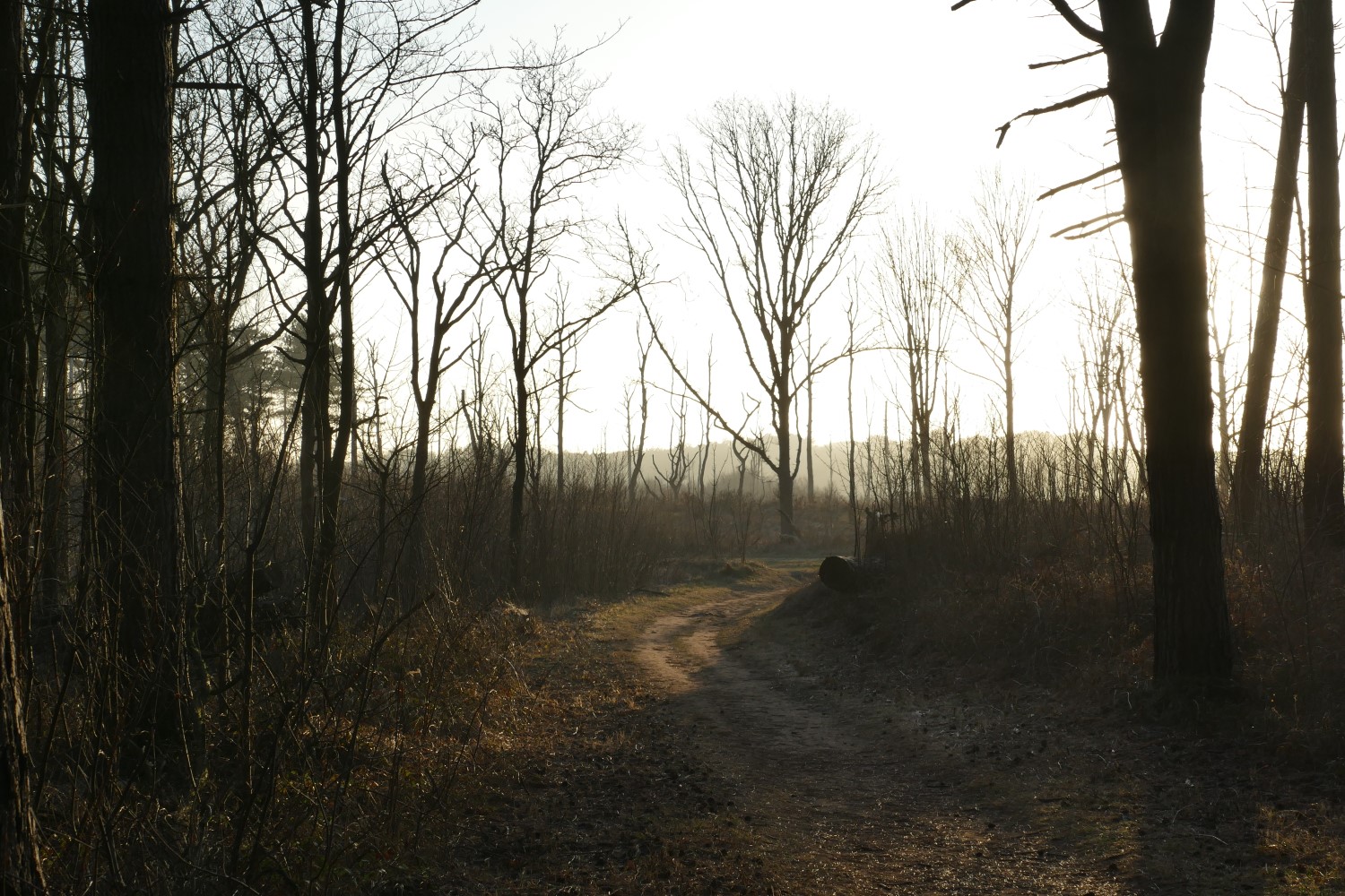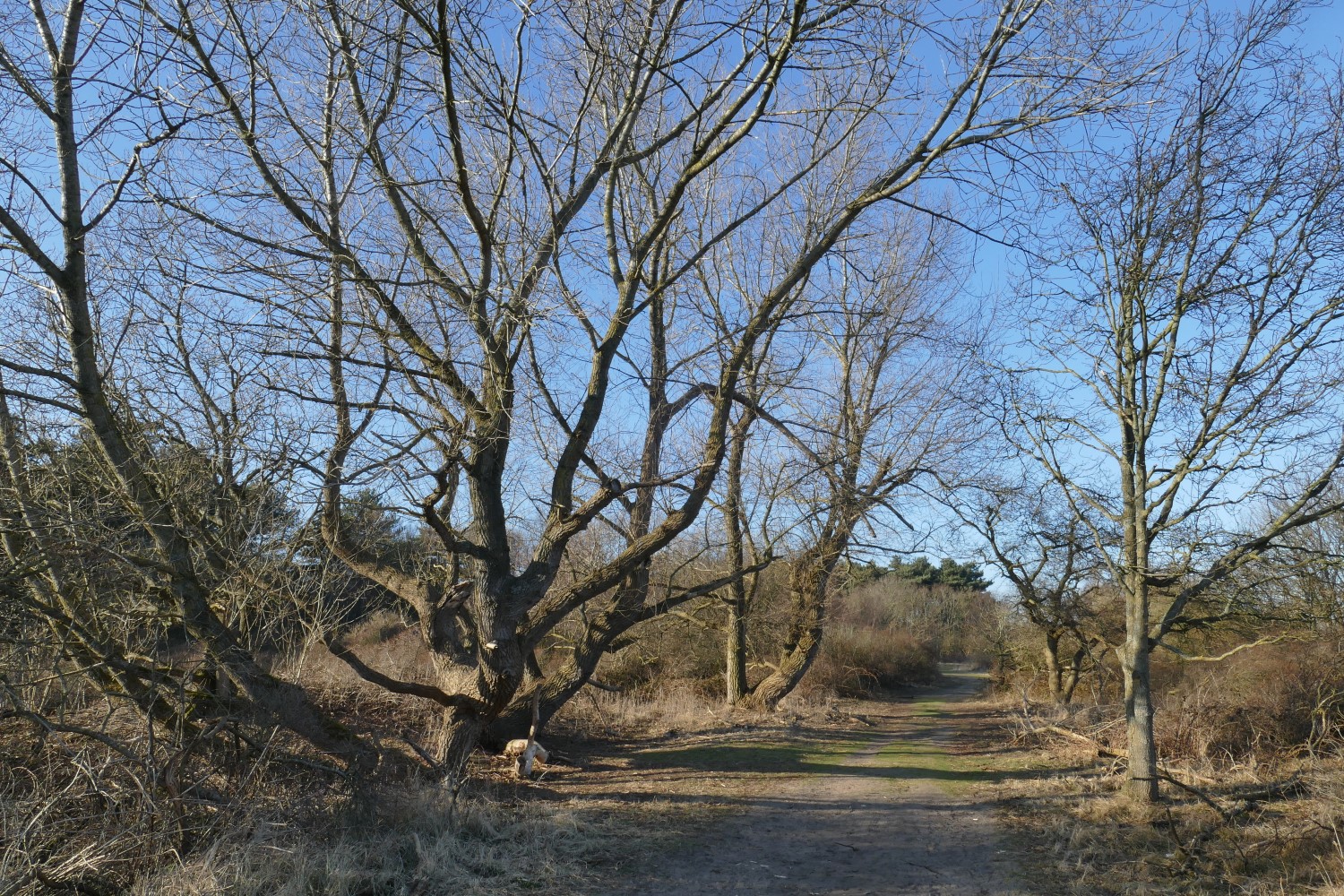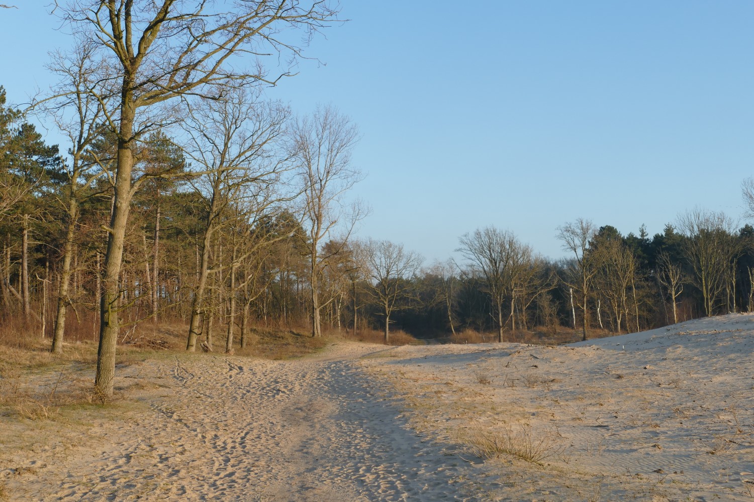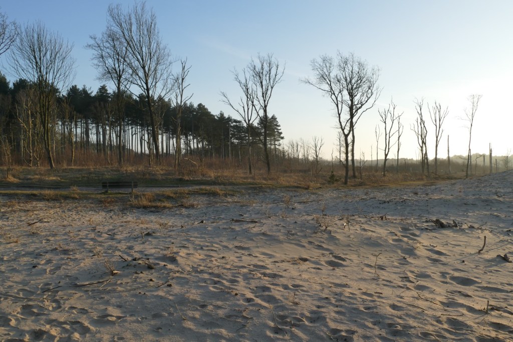 De zon staat al laag; het avondlicht strijkt over het duin… We komen opnieuw bij een fietspad: de Van Oldenbarneveldweg. We steken over. Er is daar een stuk duinbos omgehakt en de grond is afgeplagd. Wind en zand kunnen hier weer vrijuit met elkaar stoeien!