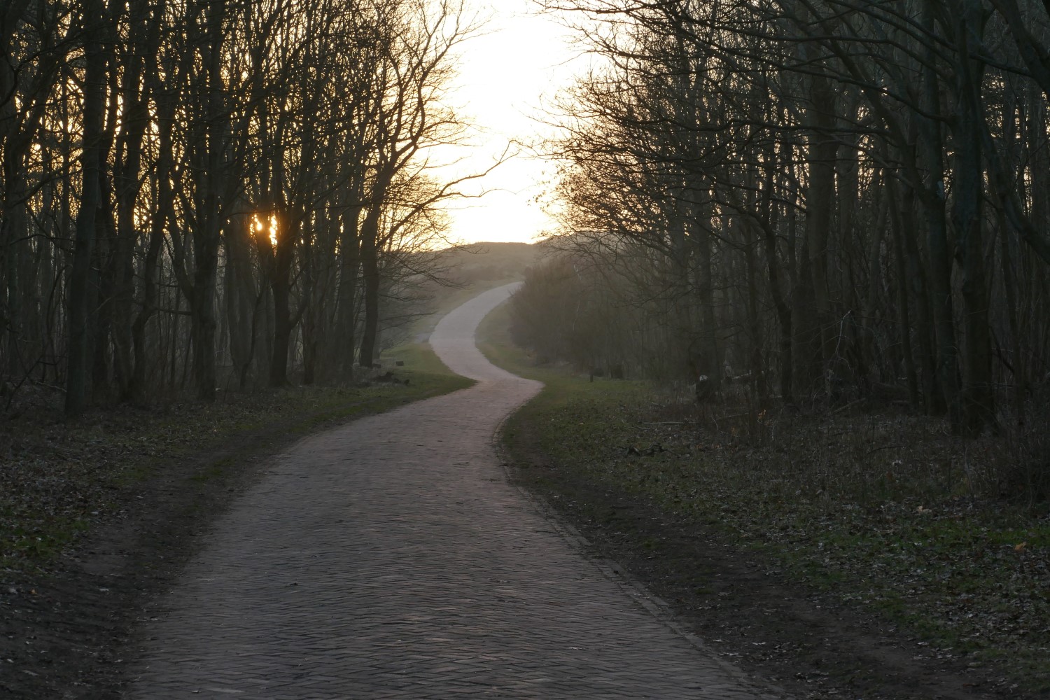 De zon nijgt ter kimme… Als we weer op de Middenweg staan, zien we ze haar laatste stralen over het duin strooien…