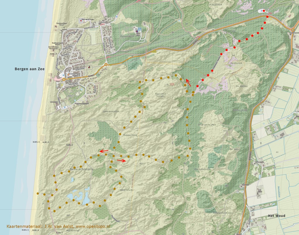 Op de kruising voorbij de Takkenberg (zie kaartje) gaan we meestal linksaf; vandaag echter gaan we naar rechts en lopen we naar zee door een mooi stuk open duin, tot op het fietspad van Bergen aan Zee naar Wimmenum.