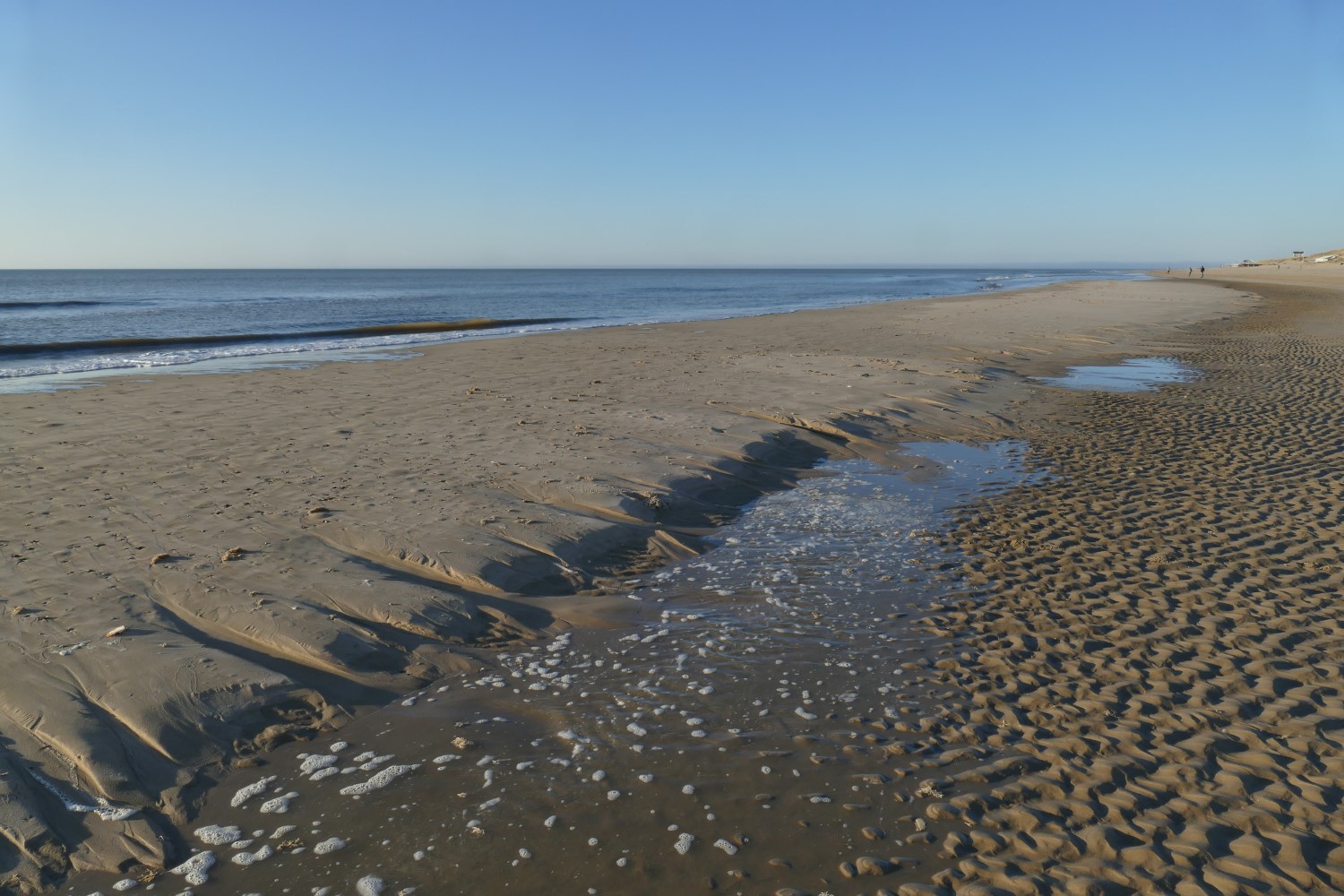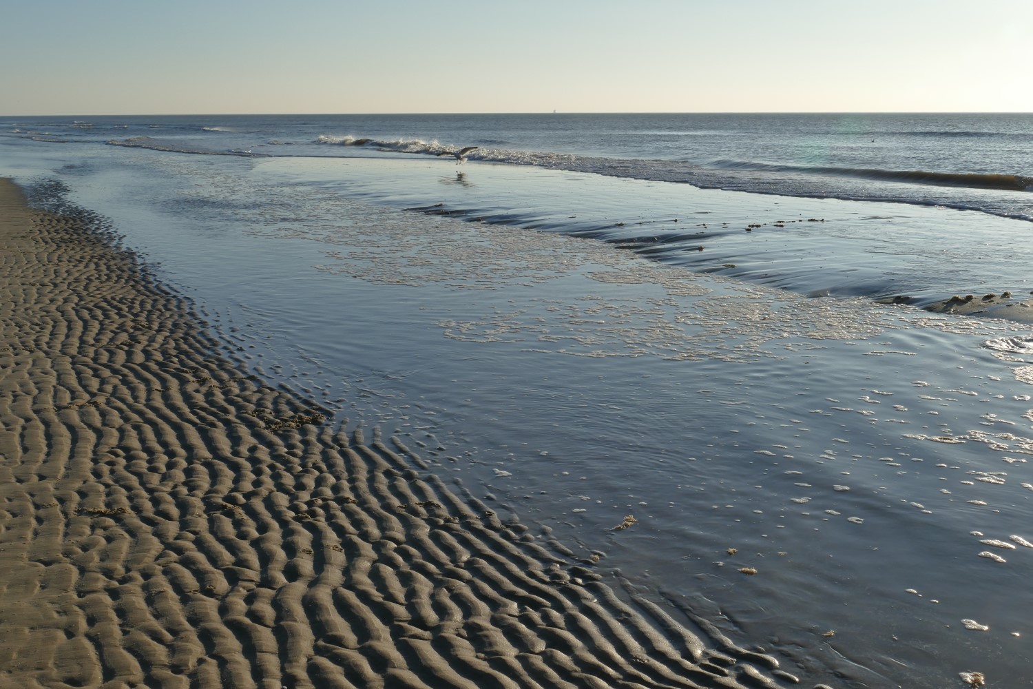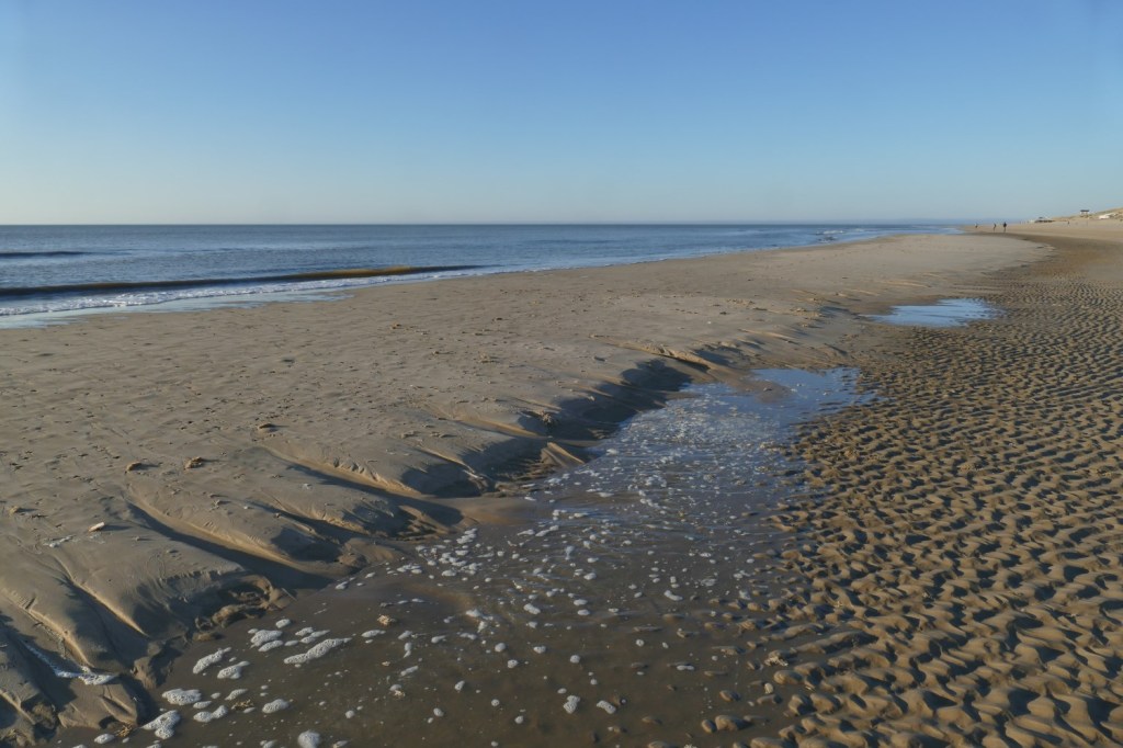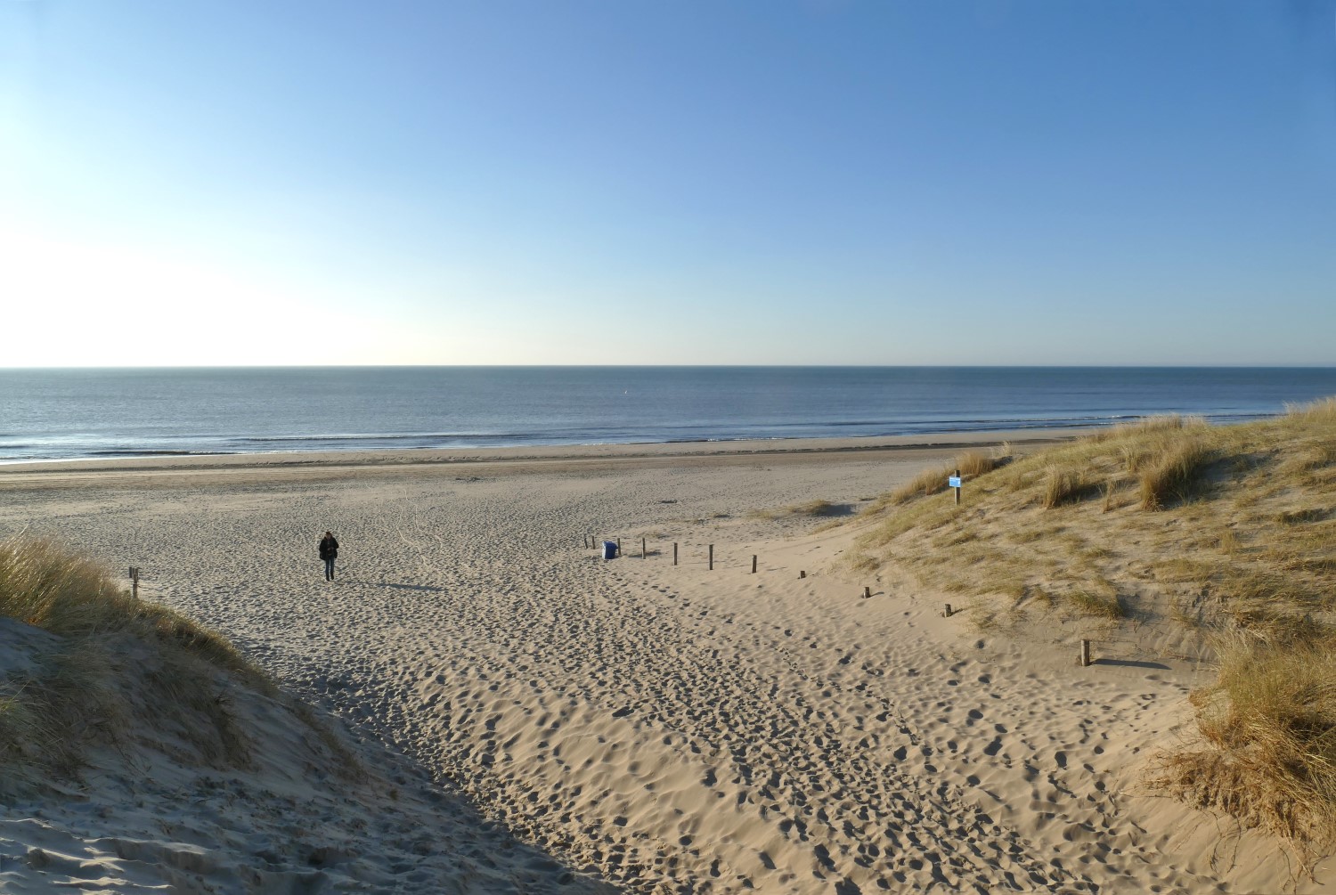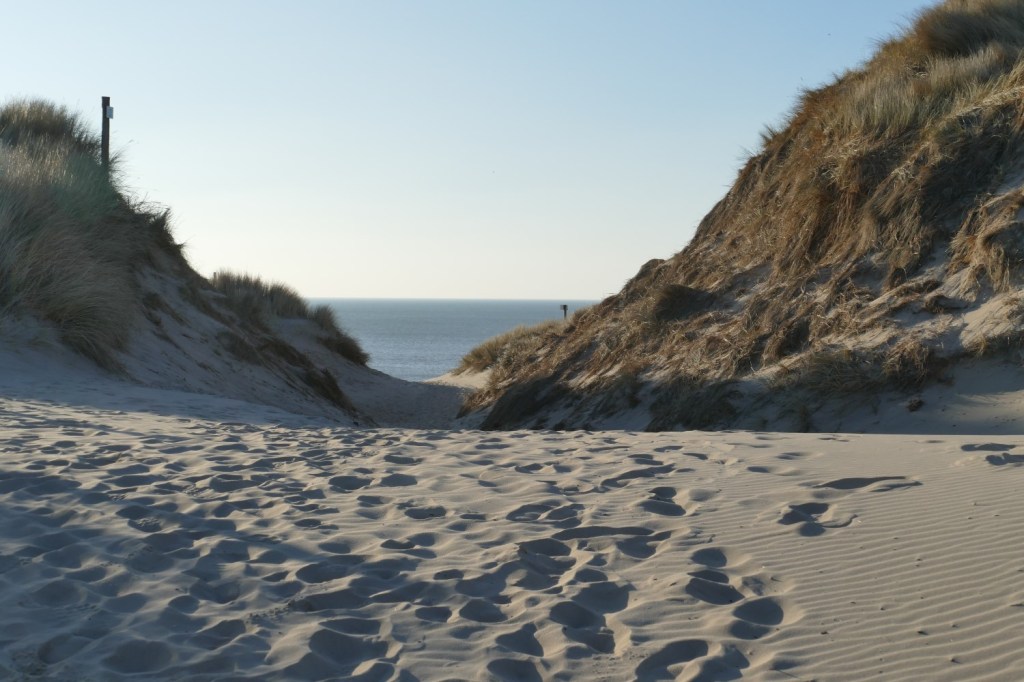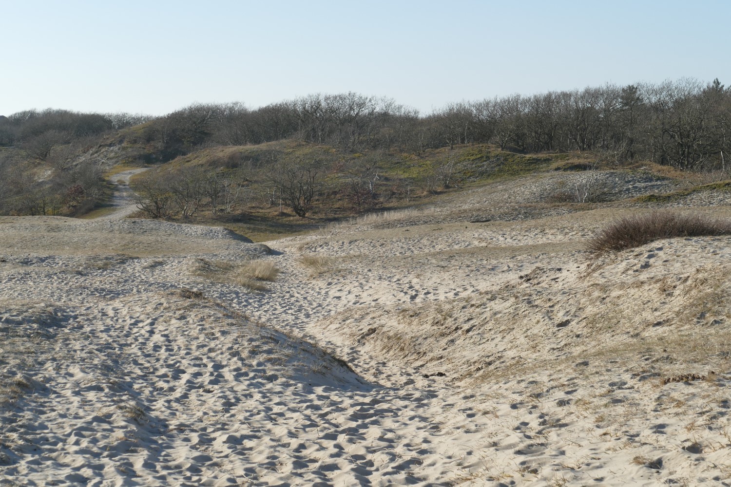 Op het fietspad gaan we linksaf en even verderop rechtsaf, door diep mul zand omhoog – en weer omlaag, naar het quasi verlaten strand…