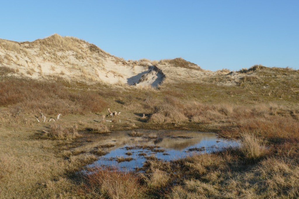 Er liggen hier ook een paar mooie duinmeertjes. De blauwe lucht weerspiegelt diepblauw op het water, de avondzon legt over aarde en planten een warme oranje gloed. De camera’s maken overuren…