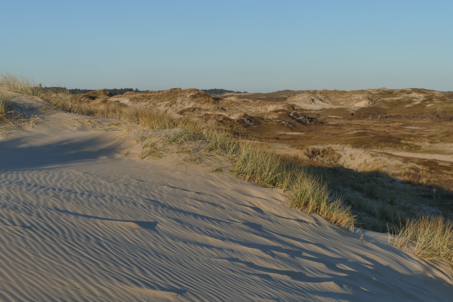 We klimmen weer omhoog door het diepe mulle zand. De duinen liggen er prachtig bij in het stralende licht van de zon die denkt dat het stilaan tijd is om onder te gaan…
