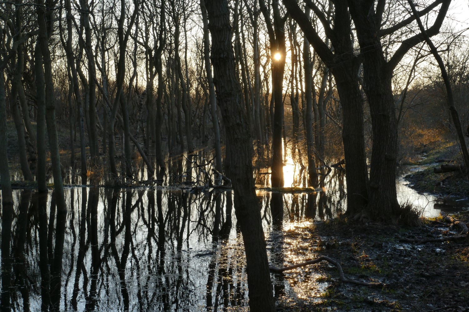 Je kunt goed zien dat het water hier de afgelopen tijd hoog heeft gestaan, hoger dan nu! Volgens mij kon je hier zelfs een tijdje niet passeren omdat de boel helemaal onder water stond! De duinmeertjes zijn in elk geval goed gevuld en in een nabijgelegen bosje staan de bomen met hun voeten in het water!