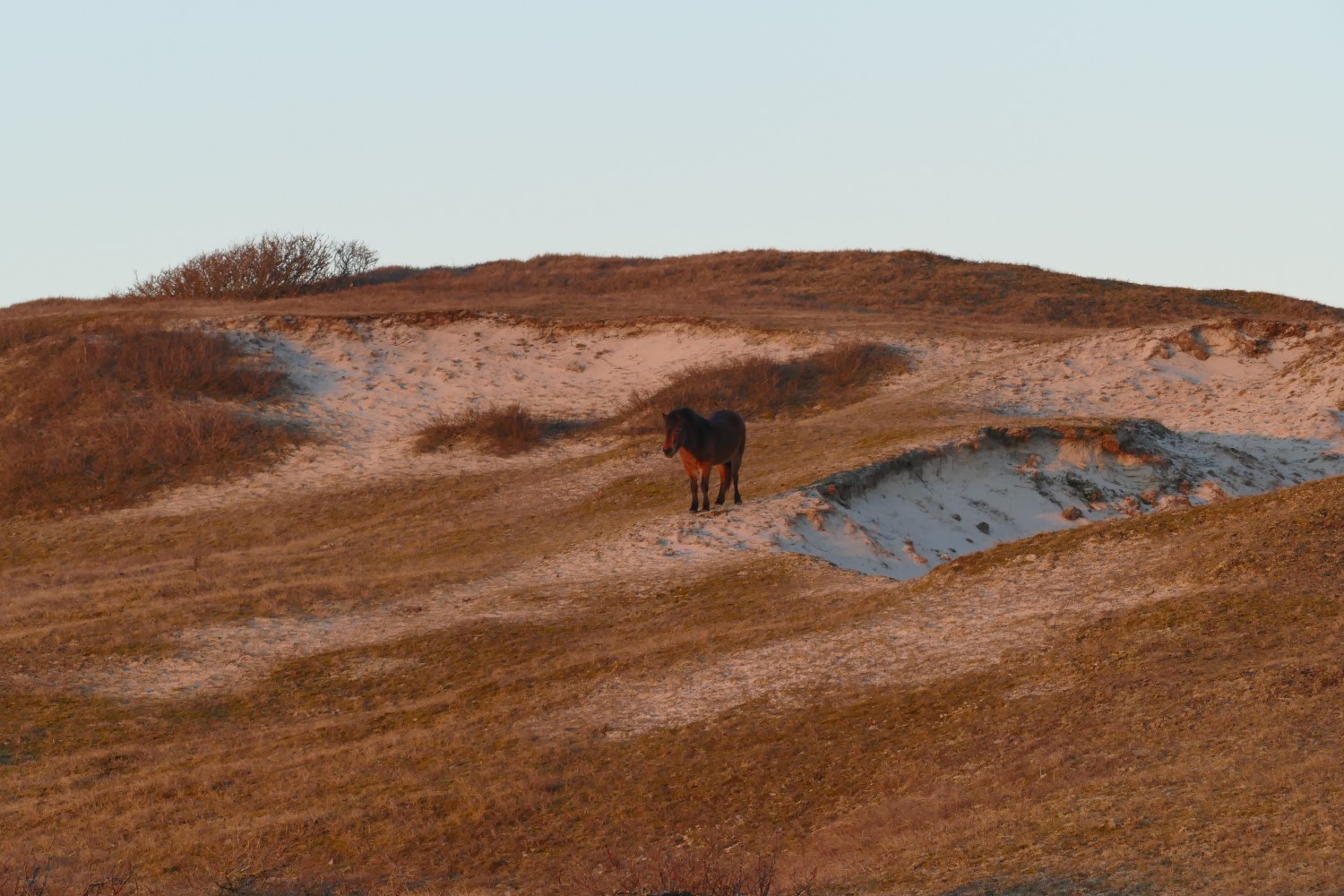 Het wordt koud en de zon gaat nu echt bijna onder. Dat betekent dat we er flink de pas in moeten zetten, want je mag hier alleen maar lopen van zonsopkomst tot zonsondergang… Maar het is vandaag te mooi om blindelings door het landschap te racen. De duinruggen kleuren rood in de ondergaande zon. We zien een paar Exmoor ponies: merrie en veulen. De hengst staat verder-/hogerop en houdt ons goed in de gaten.