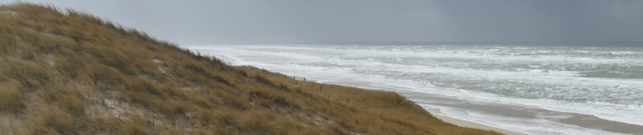 We lopen langs de oude duinakkertjes, steken het fietspad over en over bospaden lopen we richting de Krim. Daar maakt het pad een flinke slinger en lopen we met de wind op kop naar een volgende bosje. We bereiken de Middenweg en die volgen we naar de strandopgang. Af en toe worden we gezandstraald, maar het wordt pas echt erg als we de zeereep over moeten! Met 80-100 km/u stuift het zand op! Je moet je er echt tegen beschermen want het doet zeer als het over je huid schuurt. De dikke sjaal en de capuchon komen goed van pas.