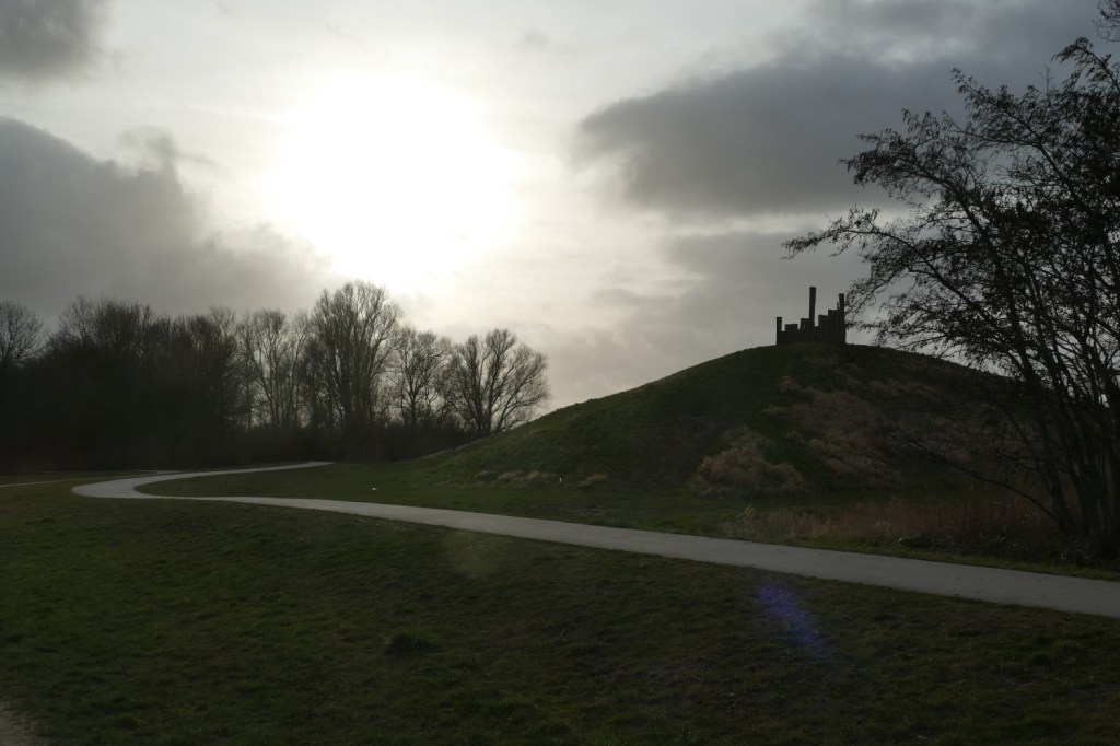 Ik kom langs de uil, hij zit verstopt in het struikgewas. Ik loop de andere heuvel op, die waar het Beachpark zou moeten komen. De Zomerdel ligt er mooi, sereen bij… Dan loop ik door de bosstrook (ik vind zowaar nog restanten van de rode kelkzwam) en langs de Saskevaart terug naar de auto.