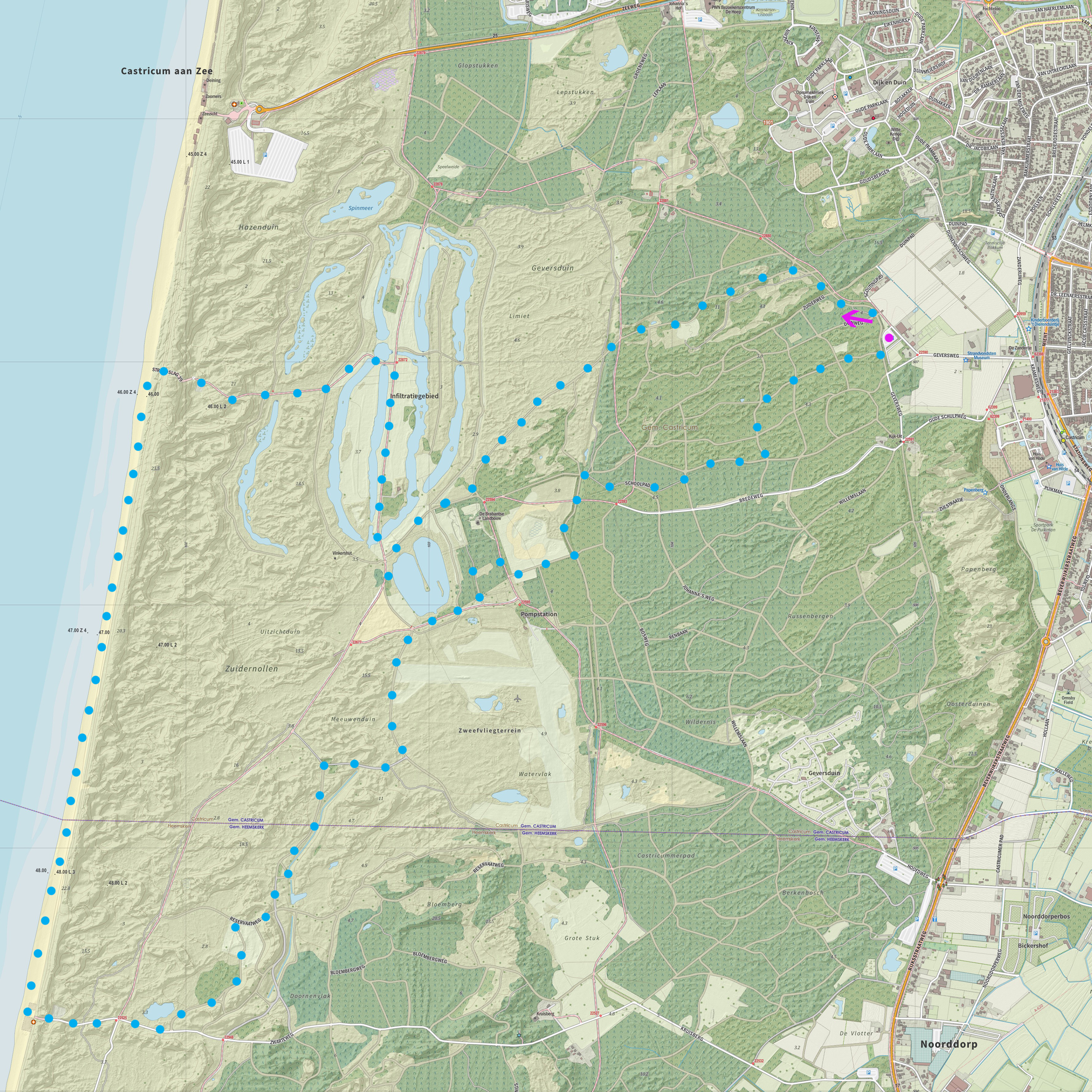 Vandaag maakten we alweer een wandeling in de duinen. Deze keer parkeerden we bij Castricum. We wandelden door het bos en langs het infiltratiegebied naar zee. Over het strand liepen we naar de strandopgang Heemskerk en vandaar ging de wandeling weer naar Castricum. Alles bijeen zo’n 12 kilometer, schat ik. Wij deden er de hele dag over… Maar er is ook zó veel te zien onderweg! Hieronder de kaart en een paar thematische collages.