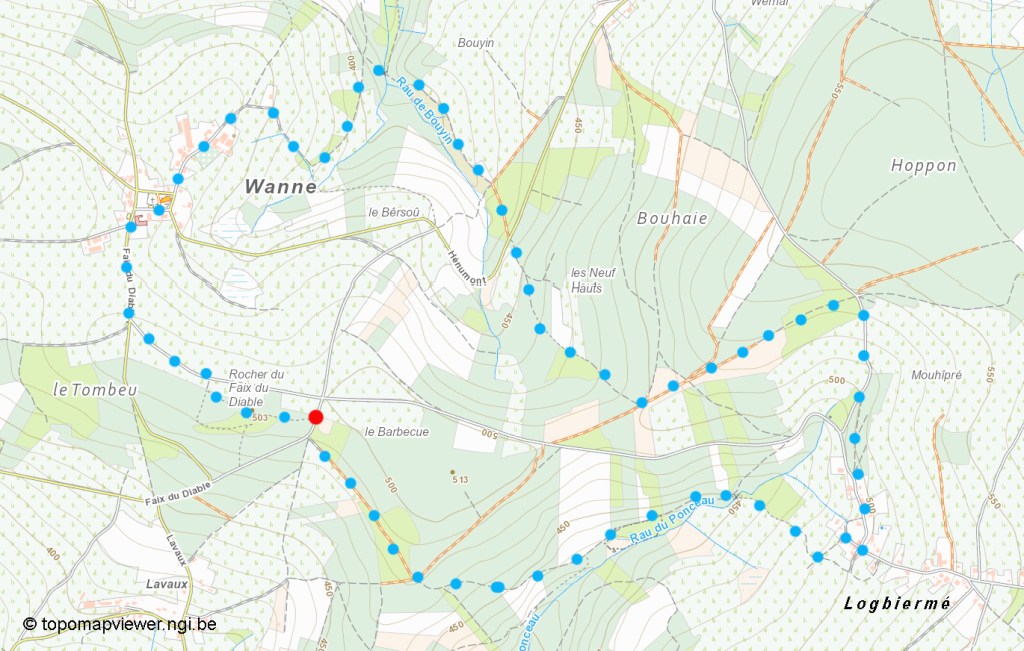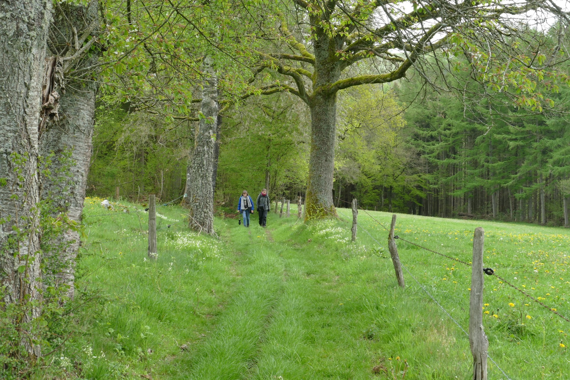 We lopen Logbiermé uit en nemen het asfaltweggetje richting Hénumont. Bij de bosrand gaan we naar links – gisteren gingen we hier rechtsaf. We lopen weer op de Vieux Chemin de Luxembourg die ooit Trier met Tongeren verbond… Het begint te regenen maar het duurt gelukkig niet lang. Na een kleine kilometer nemen we een pad naar rechts en dalen door het bos en tussen de weilanden af naar de Ruisseau de Bouyin die we oversteken bij een gué – maar er ligt ook een charmant bruggetje over het riviertje. In een weiland staat een enorme stier; zijn madame ligt er vredig naast, wetend dat ze goed beschermd wordt! Wat een brute oerkracht stralen die beesten uit. Je haalt het niet in je hoofd een wei te betreden als daar zo’n kloeke jongen in staat.