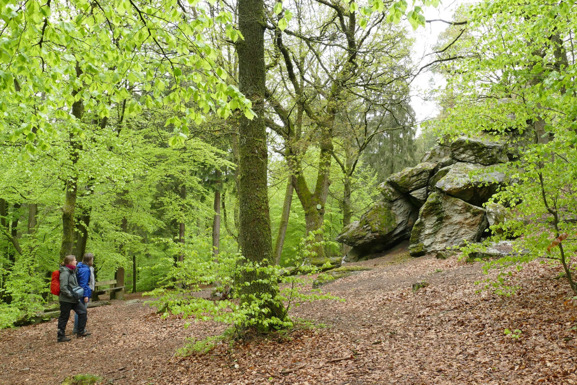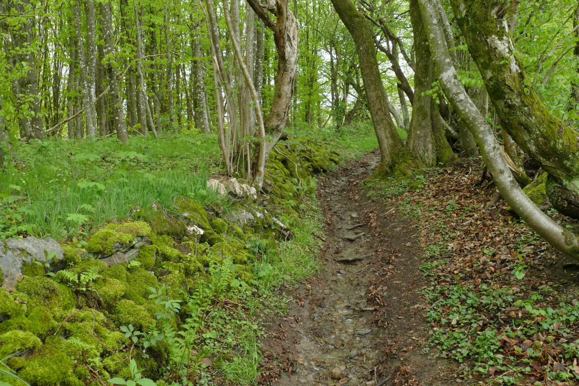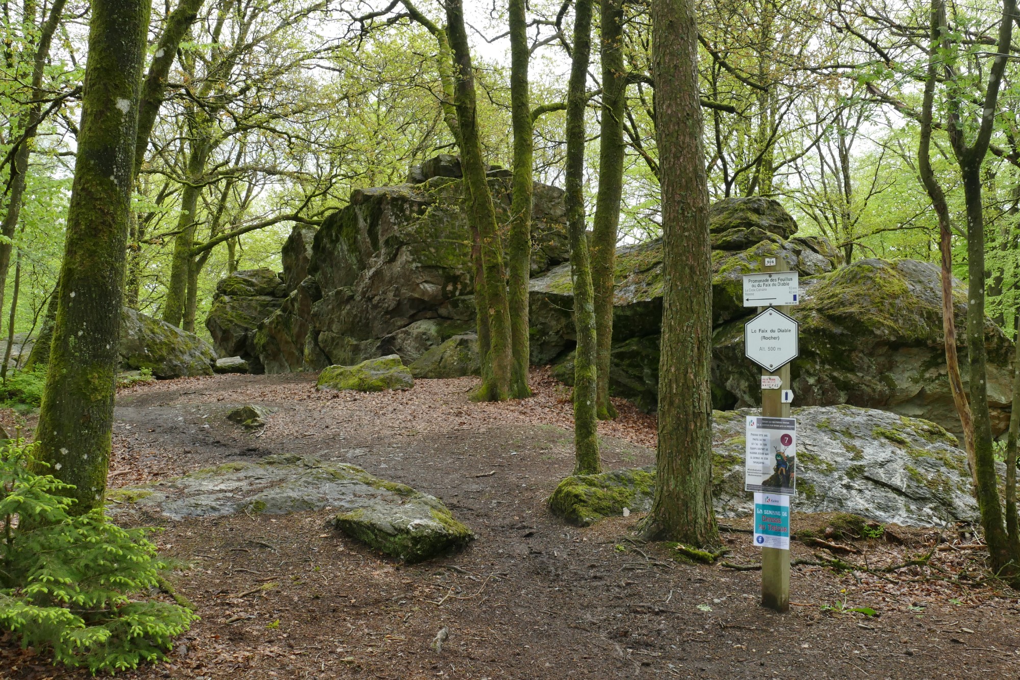 We nemen het paadje langs de bosrand en arriveren bij de Rocher du Faix du Diable: de Duivelsrotsen, een klein rotsmassief waar een prachtige legende bij hoort.