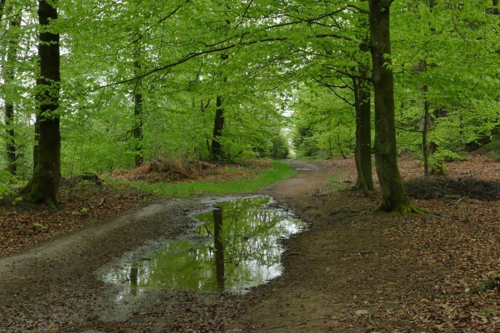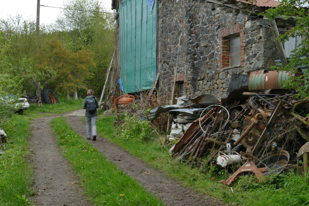 Over prachtige boswegen dalen we van de parkeerplaats af in de vallei van de Ruisseau du Ponceau. We komen op bekend terrein; hier liepen dochterlief en ik gisterenmiddag ook. Net als toen nemen we de Chemin des Écoliers. Vandaag regent het gelukkig niet; gisteren liepen we hier door een riviertje, nu is het pad zo goed als droog… We nemen wel een afslag eerder en komen over het erf van een rommelboerderij in Logbiermé uit.