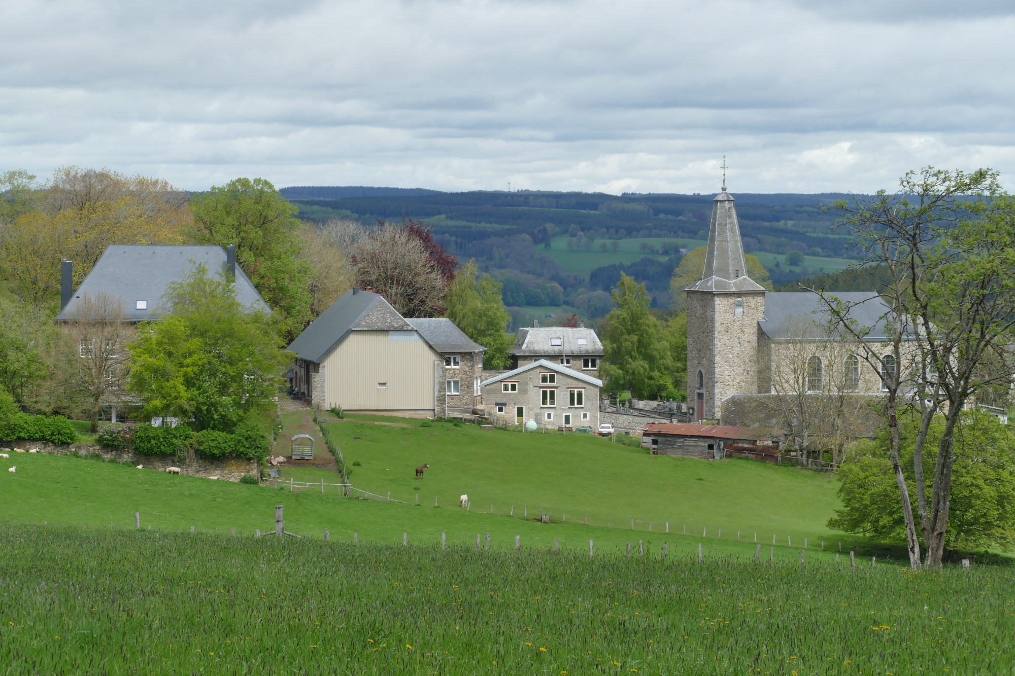 We wandelen langs het Chateau de Wanne (een groepsaccommodatie) het dorp weer uit en nemen het asfaltweggetje richting Logbiermé. Van hier heb je een mooi zicht op Wanne!