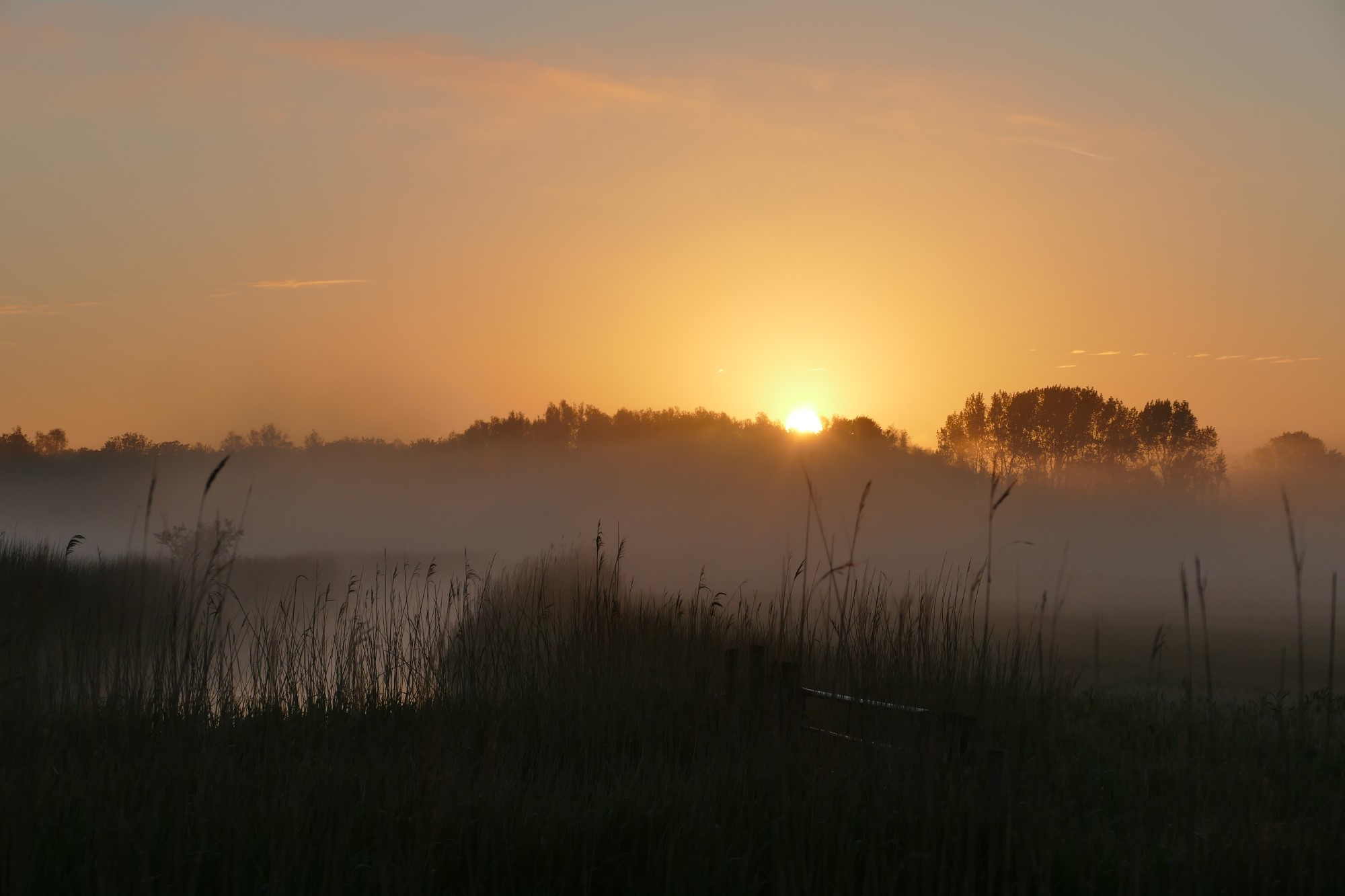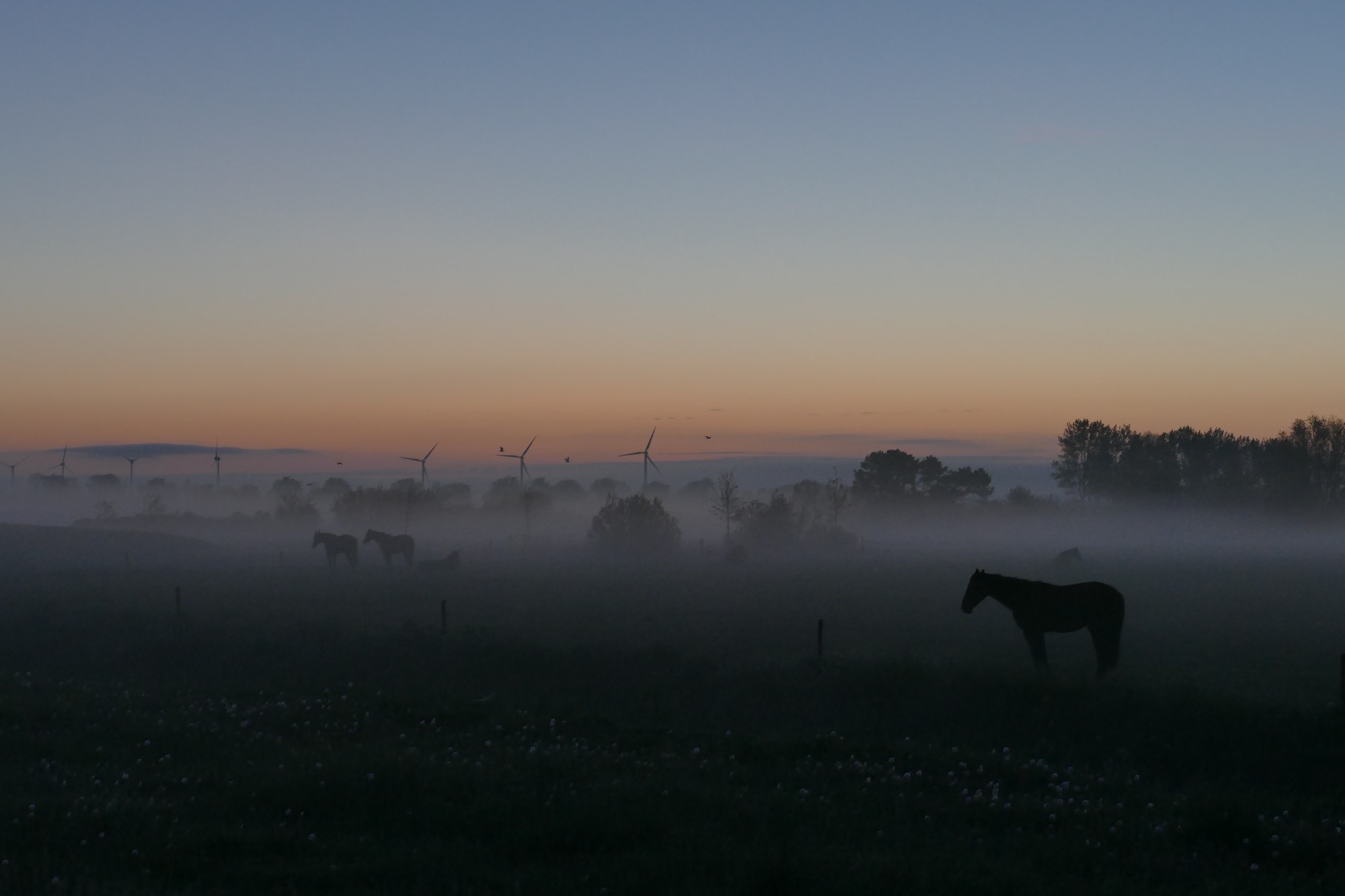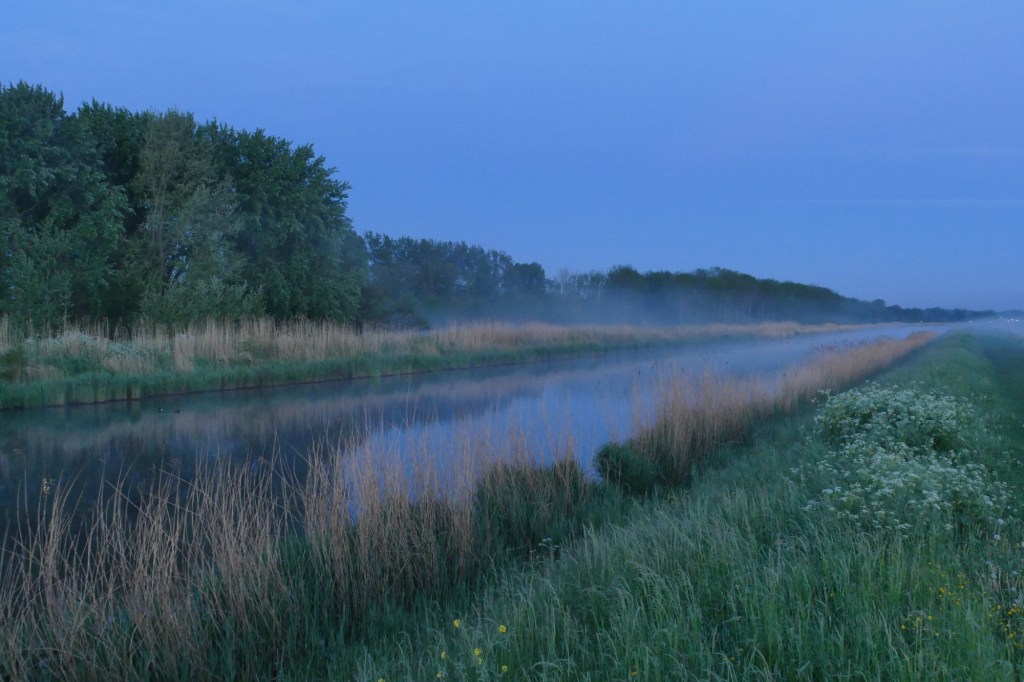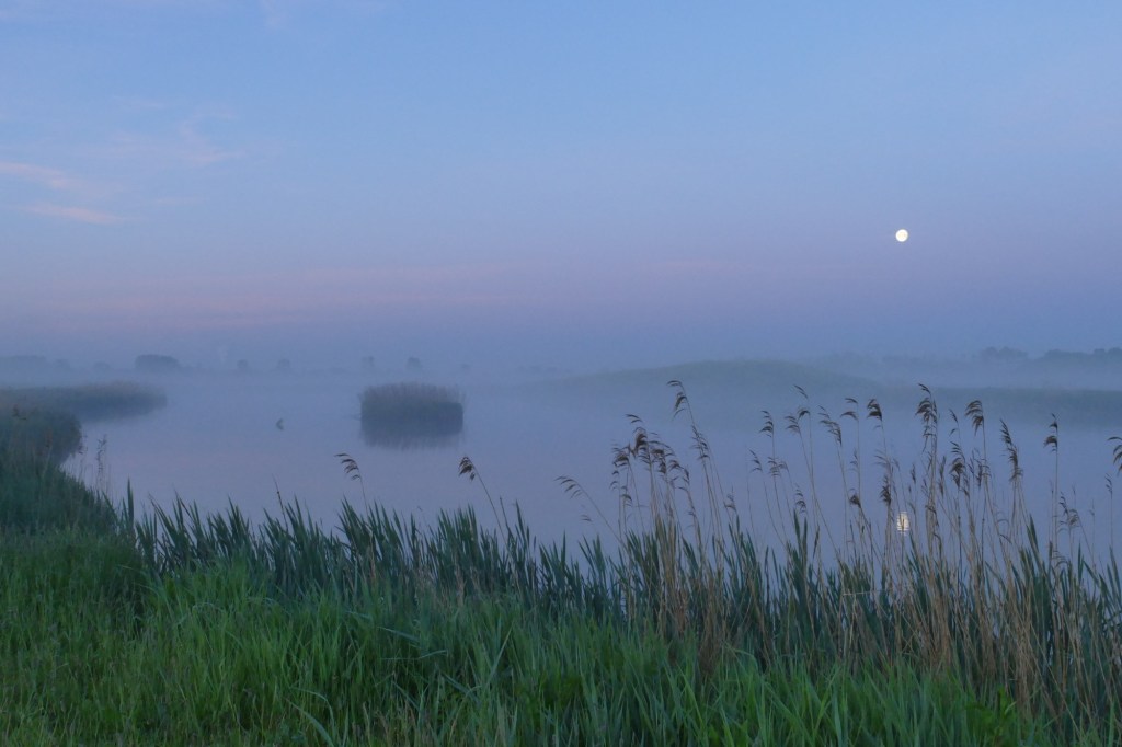 Twintig minuten later parkeer ik de auto aan de Wagenweg. De hemelkoepel is nog altijd wolkeloos en blauw, en in het noordoosten licht nog steeds een zachtoranje gloed op aan de einder… Over het land liggen sliertige dekens van nevel en over dit ochtendlijke tafereel strooit de volle maan haar tanende licht…