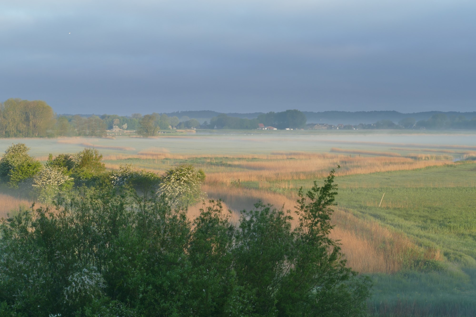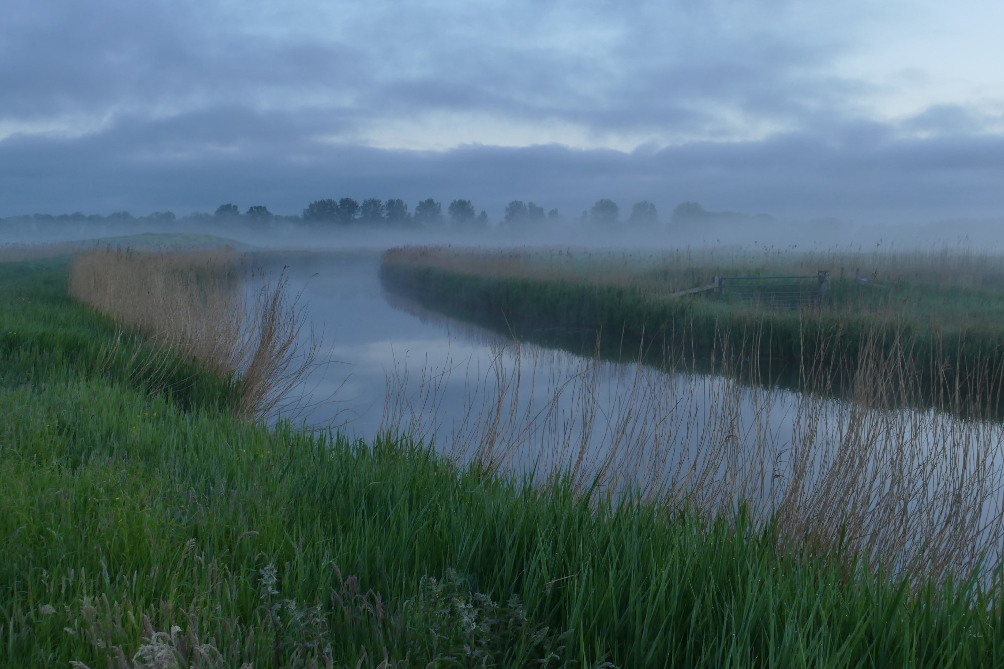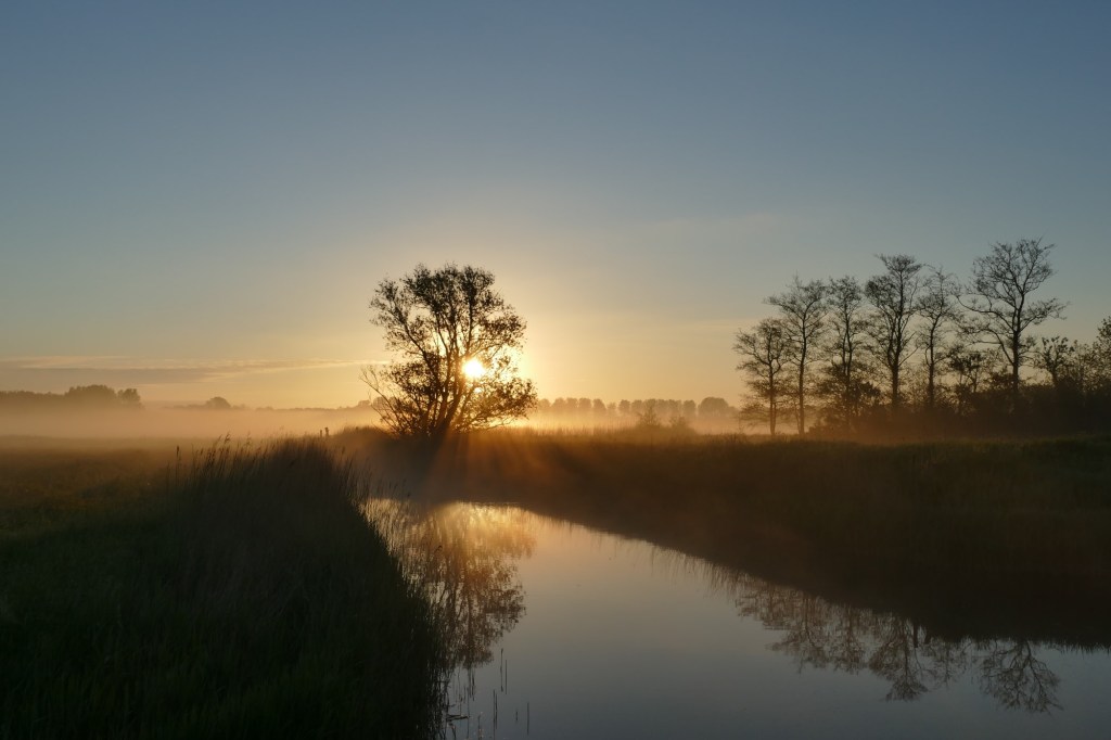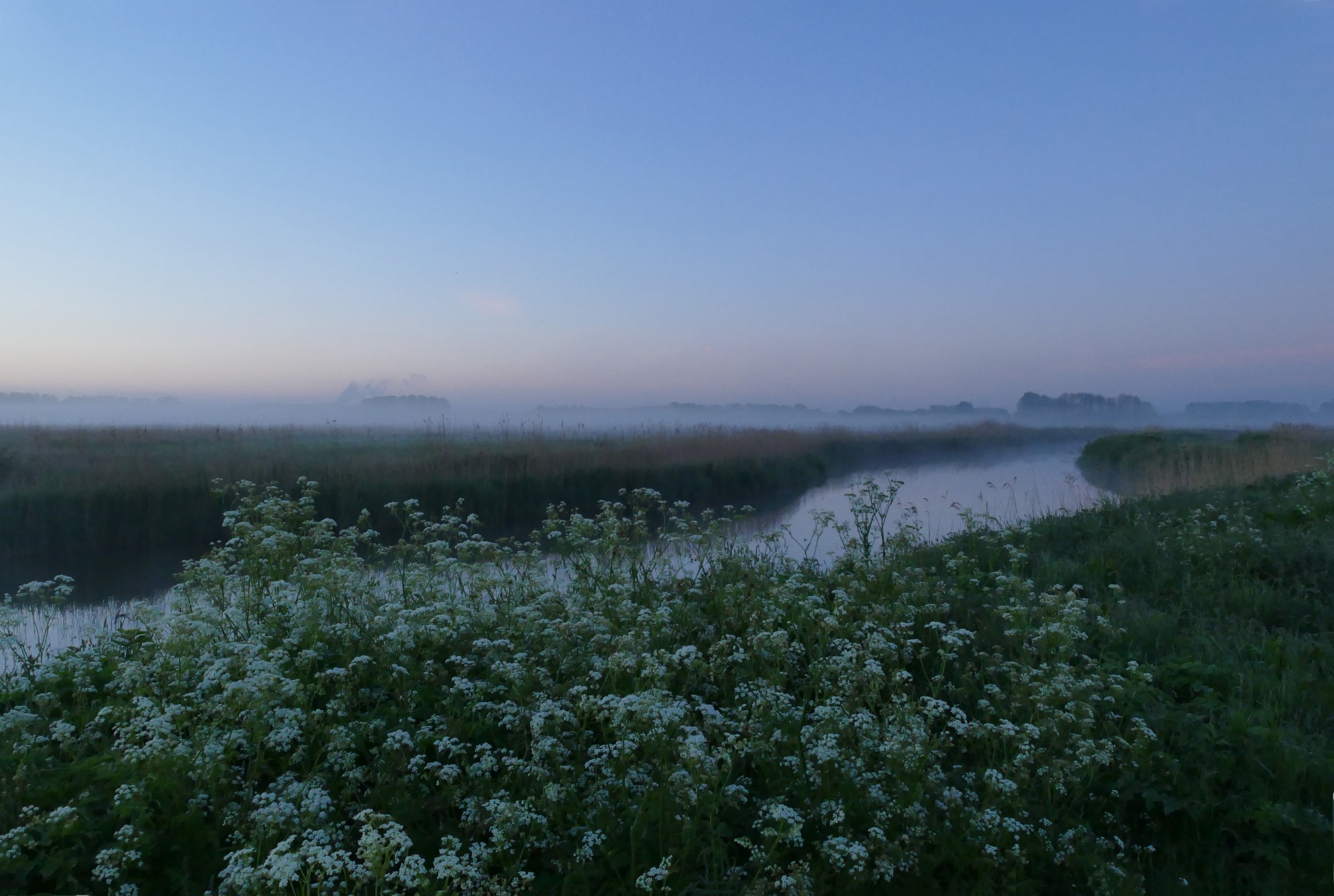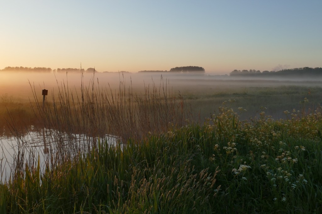 Vervolgens loop ik de grasdijk op die de grens vormt tussen de ‘oude’ en de ‘nieuwe’ Kleimeer. De roerdomp laat uitbundig van zich horen, het misthoorngeluid dat hij voortbrengt klinkt zo ’s morgens vroeg nog mysterieuzer dan anders, vind ik. Verder is het een gesnor, getsjilp en gegak van jewelste en hoor je nog geen verkeer… Als je buiten bent, horen die natuurgeluiden wat mij betreft bij het begrip stilte… Als op een gegeven moment een auto met een opgevoerde motor optrekt, ervaar ik dat als een Grote Inbreuk… Hoe durf je het om zo vroeg op de ochtend zoveel herrie te maken. Maar het geluid sterft weg en de stilte neemt het weer over. Overigens wordt tijdens zo’n vroege wandeling ook je neus getrakteerd op allerlei intense geuren… van vochtig land tot meidoornparfum!