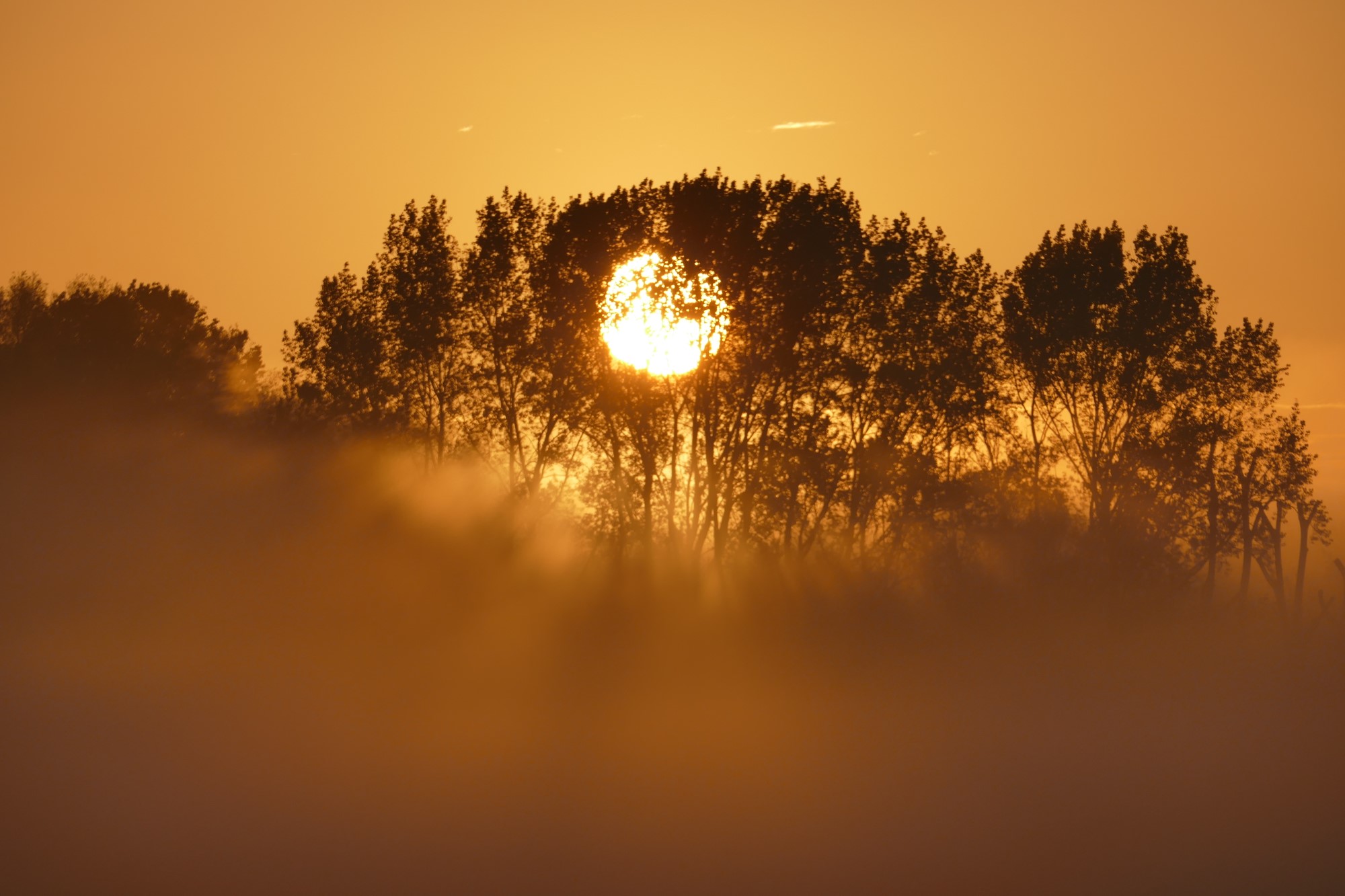Het is al na half zes als de zon eindelijk boven de bomen komt en met haar oranje licht de nevelslierten doet oplichten. Het lijkt alsof de roerdomp er nog een schepje bovenop doet!