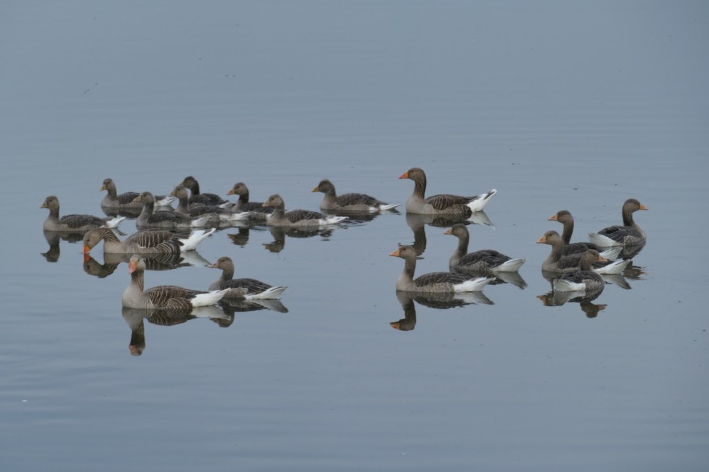 Ik loop het hele pad langs de Kleimeer af. Intussen schuiven er steeds meer wolken voor de zon. Vanaf de brug over de Saskevaart zie ik een groep ganzen zwemmen.