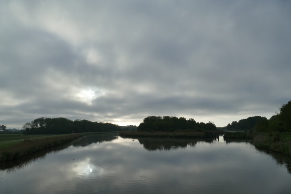 Ik verlaat de Nauertogt en loop weer een grasdijk op. Ik zou ook kunnen zeggen: een modderdijk… Ik glibber een eind verder en krijg na een paar honderd meter weer uitzicht op de Kleimeer. De zon staat inmiddels een stukje hoger en ik vind het verbazingwekkend hoeveel nevelbanken er al zijn weggebrand in het afgelopen kwartier of zo…