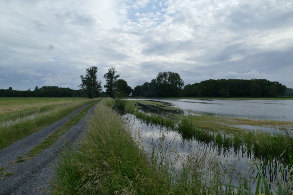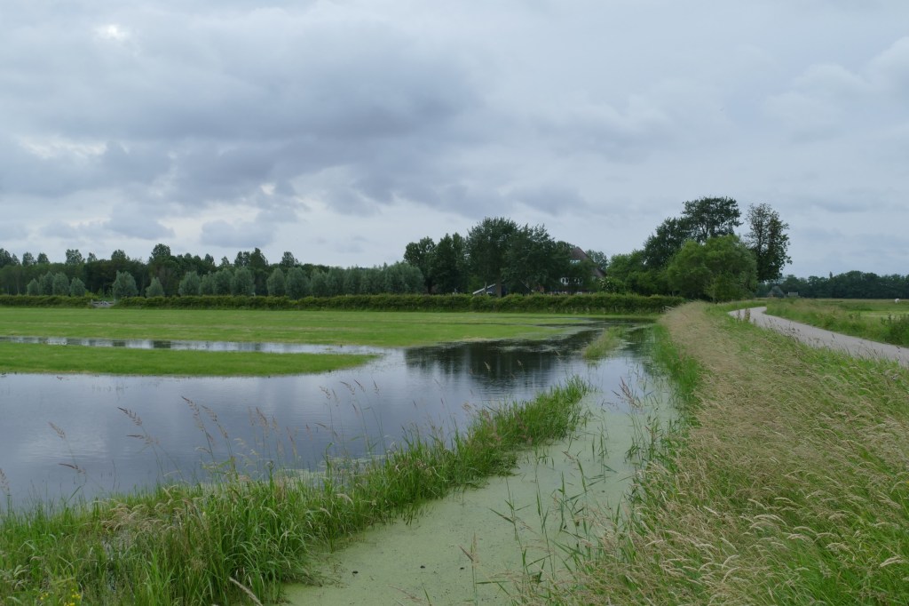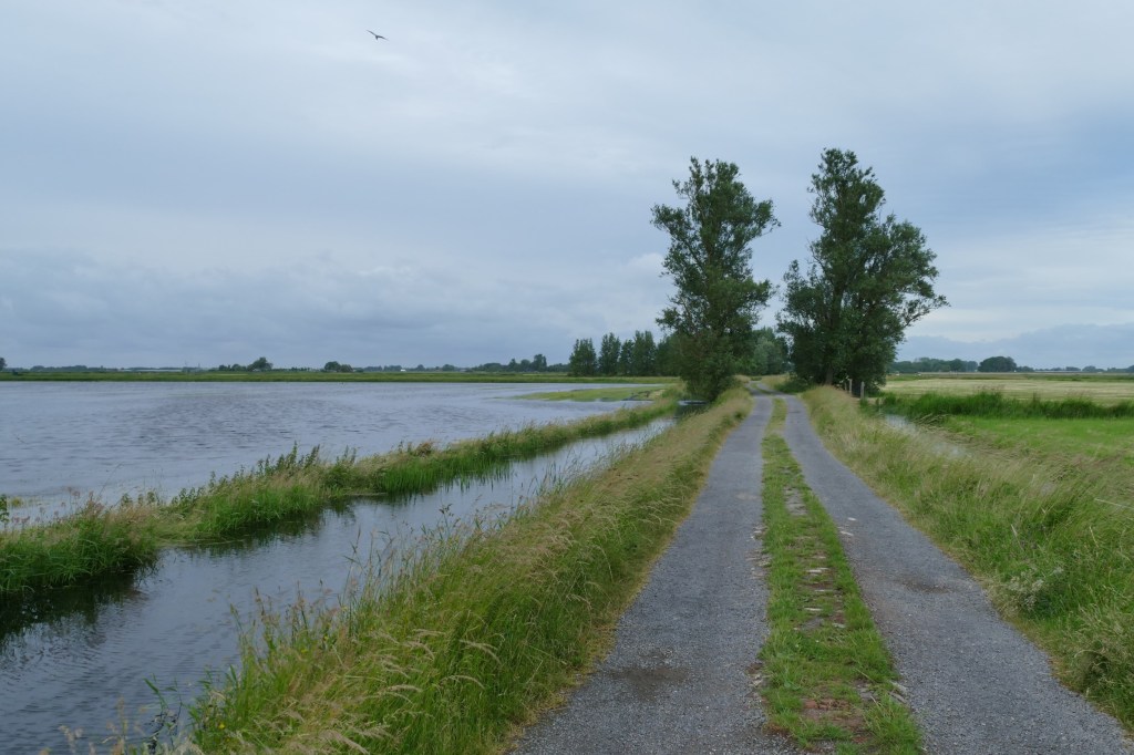 Het is maandagavond, 21 juni, de langste dag. Ik behoor tot de pessimisten die op de dag van de zomerzonnewende met pijn in het hart vaststellen dat de dagen weer gaan korten… Het heeft vandaag de hele dag geregend – en dat bovenop de vele regen die er de afgelopen dagen viel! Ik wil wel eens gaan kijken of de waterberging in de Zuurvenspolder zijn werk heeft gedaan. Net als ik op het punt sta om op de fiets te stappen, komen buurman en buurvrouw aan fietsen, en zij adviseren me om naar Over ’t Hek te gaan kijken – ze komen er net vandaan, daar staat heel wat water! Zo gezegd, zo gedaan. Ik stel mijn plan bij en vertrek. In de weilanden staan overal plassen, maar ik zie pas de eerste ondergelopen weilanden als ik over de Schapenlaan fiets, bij de splitsing met de Klaassen- en Evendijk.