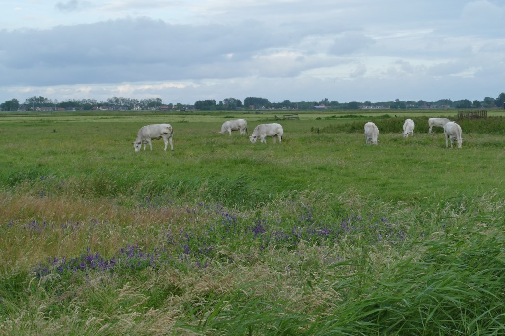 Genietend van de bloemrijke wegberm fiets ik een stukje verder. Aan de kleur van het grasland zie je of er is gemaaid. In één een van de weilanden rechts van de Schapenlaan staat het gras heel hoog en overal zie ik vogelwikke bloeien; her en der staan ook korenbloemen… Als je bedenkt dat de weilanden er vroeger overal zo hebben uitgezien, dan doet het zien van al die saai-groene graslanden toch wel enigszins verdriet… Ooit waren wij te gast bij een boer in de Yorkshire Dales. Hij vertelde dat de boeren er daar voor hadden gekozen om afscheid te nemen van veredelde grassoorten en weer alle ruimte boden aan het bloemrijke grasland van weleer. Zijn koeien waren minder ziek, hadden veel minder zorg van een veearts nodig… Híj was in elk geval om!