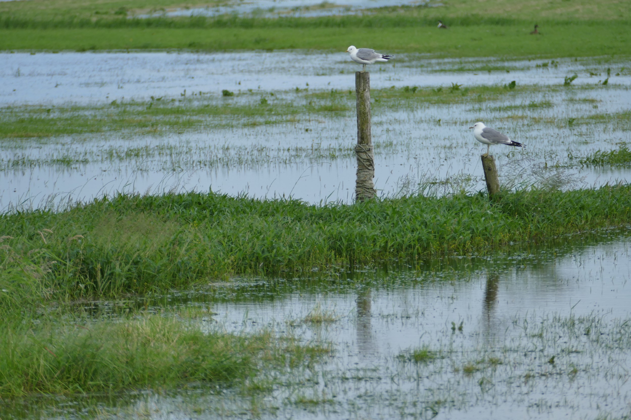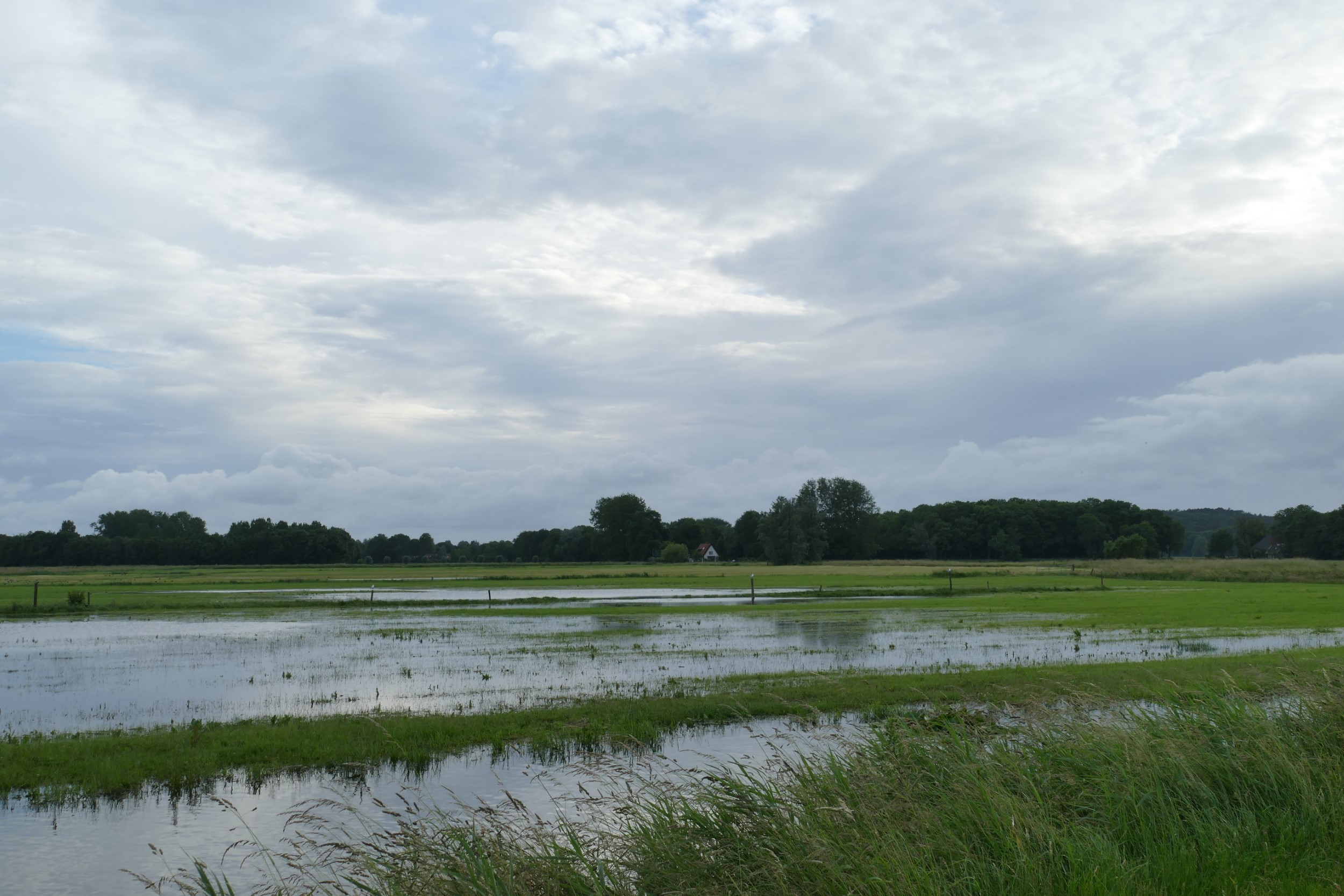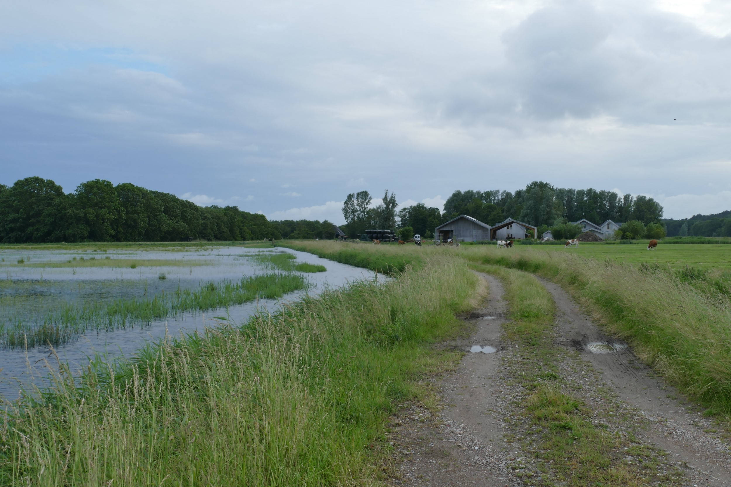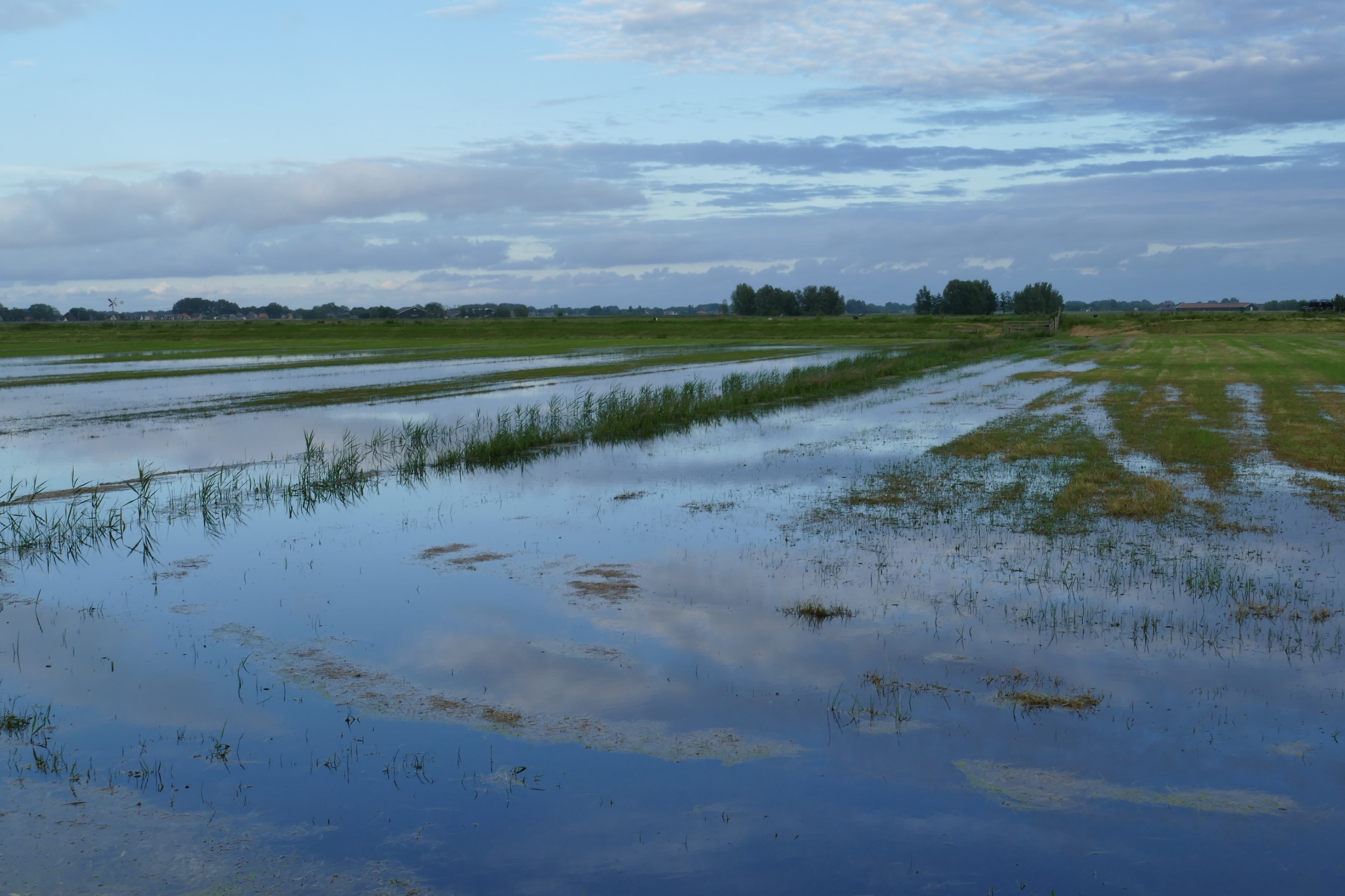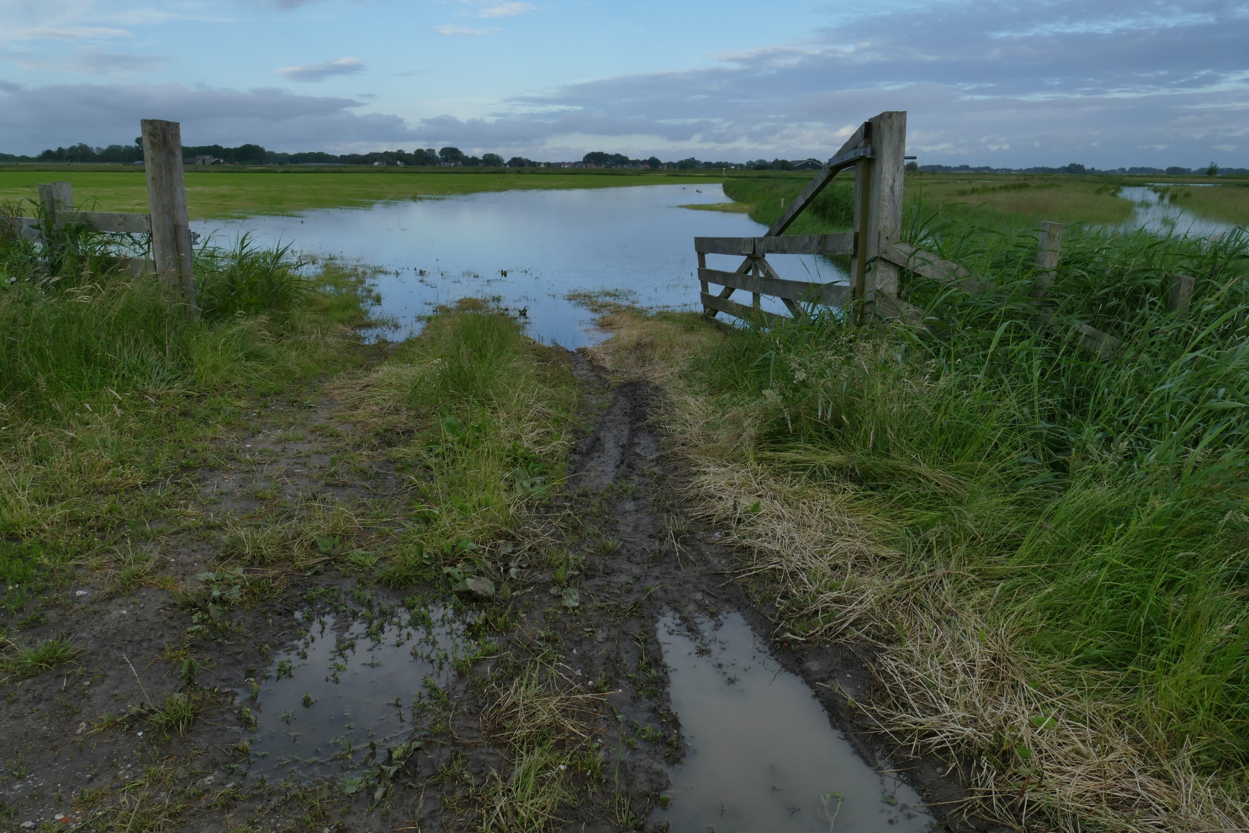 Het is maandagavond, 21 juni, de langste dag. Ik behoor tot de pessimisten die op de dag van de zomerzonnewende met pijn in het hart vaststellen dat de dagen weer gaan korten… Het heeft vandaag de hele dag geregend – en dat bovenop de vele regen die er de afgelopen dagen viel! Ik wil wel eens gaan kijken of de waterberging in de Zuurvenspolder zijn werk heeft gedaan. Net als ik op het punt sta om op de fiets te stappen, komen buurman en buurvrouw aan fietsen, en zij adviseren me om naar Over ’t Hek te gaan kijken – ze komen er net vandaan, daar staat heel wat water! Zo gezegd, zo gedaan. Ik stel mijn plan bij en vertrek. In de weilanden staan overal plassen, maar ik zie pas de eerste ondergelopen weilanden als ik over de Schapenlaan fiets, bij de splitsing met de Klaassen- en Evendijk.