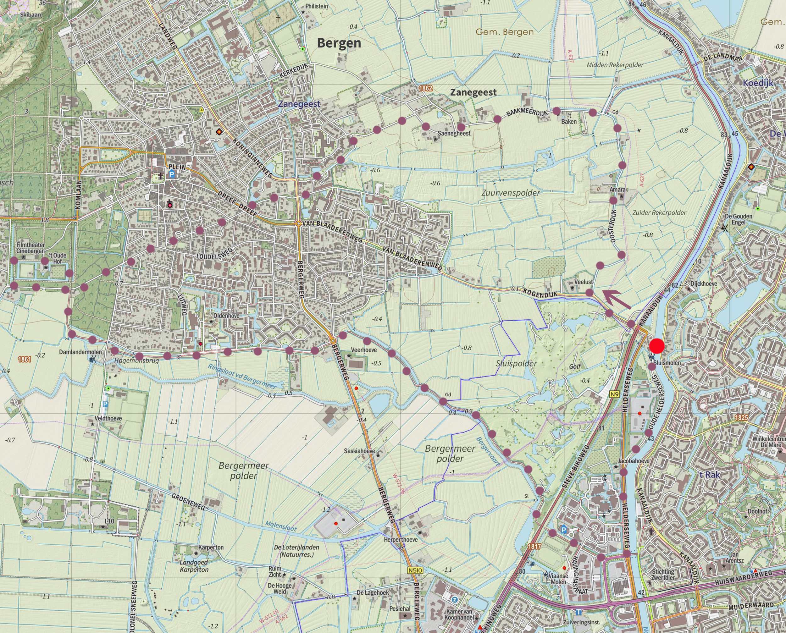 Aan het einde van de Nesdijk kom ik op een rotonde met een omstreden kunstwerk: de Poort van Bergen. Hier neem ik het fietspad langs de Bergervaart, die de scheidslijn vormt tussen de Sluispolder en de Bergermeerpolder.