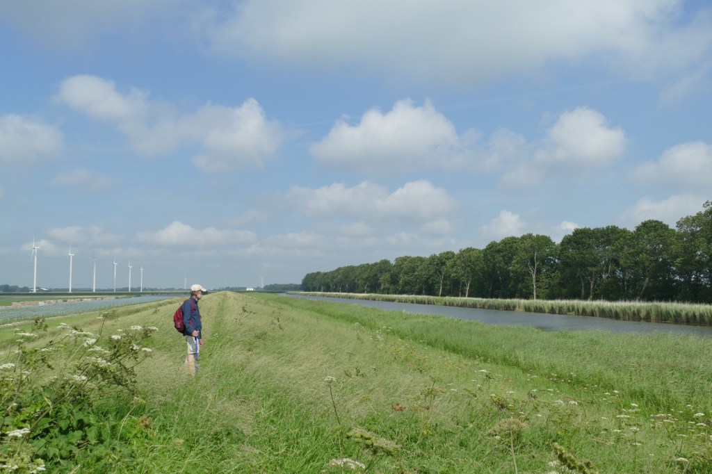 We verlaten de ‘jungle’, lopen onder het viaduct door en beklimmen de hoge, brede dijk die langs de Ringsloot ligt (vroeger dus de verlengde Langereis: het Waard-Groetkanaal). De ontwerper van deze Trage Tocht roemt het stuk over deze dijk, wij zijn er wat minder enthousiast over… Dat komt mede omdat het uitzicht naar links wordt bedorven door een zonnepanelenpark: parallel aan de vier kilometer lange dijk is men bezig een vier kilometer lange strook vol te zetten met zonnepanelen. Verderop in de polder worden nieuwe windmolens geplaatst… De Groetpolder als leverancier van groene energie! Nuttig, nodig, lelijk…
