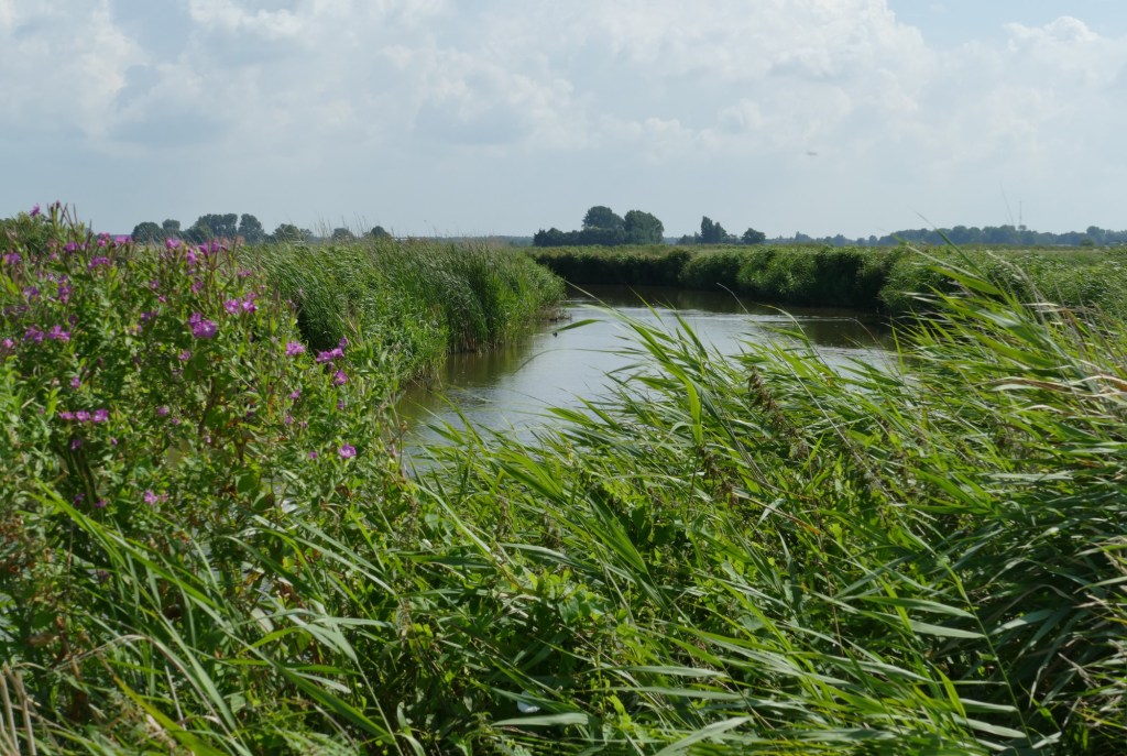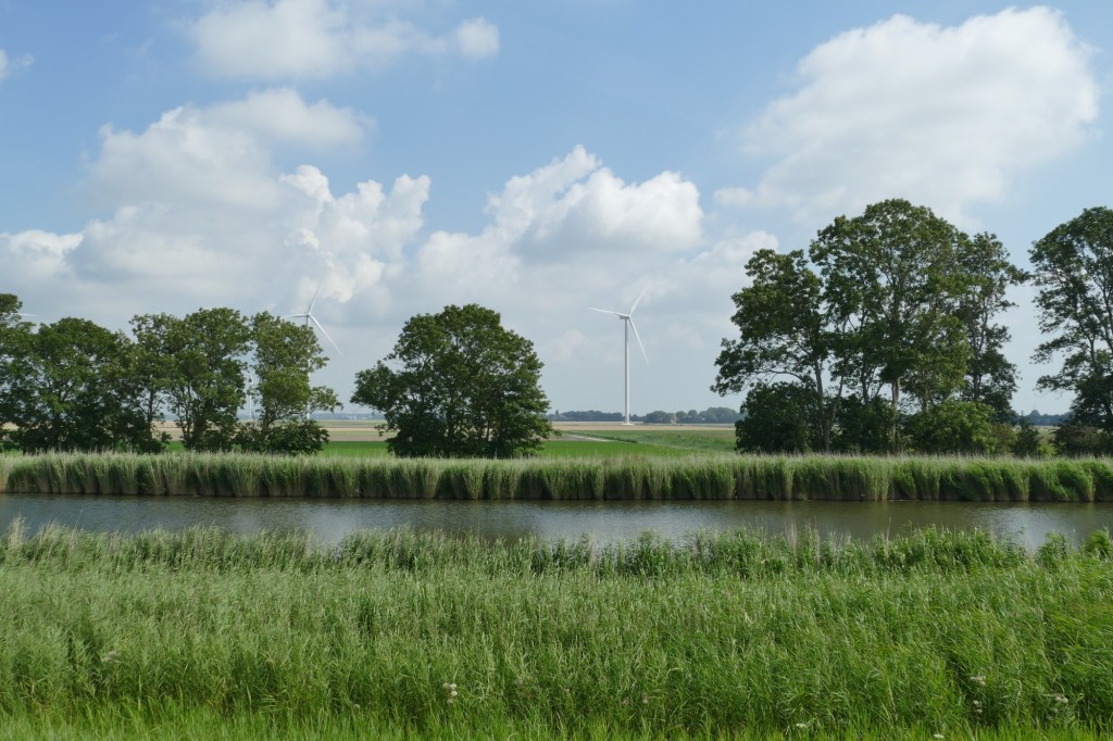 Aan de overkant van het water staan een paar rijen bomen. Tussen het groene loof schemert af en toe het rood van een pannendak. Die boerderijen staan langs de Groetweg, die ik bijna elke ochtend afreed op weg naar mijn schooltje in Slootdorp. Het is de rand van de enorme droogmakerij de Wieringermeer… Op een enkele plek kun je er een blik op werpen. Ook hier veel windmolens… Ik weet dat er over die windmolens het nodige is gezegd! Niet iedereen was/is er blij mee, maar ze staan er wel.