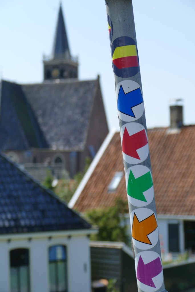 We naderen eindelijk Kolhorn, ooit een vissersdorp gelegen aan de Zuiderzee… nu ligt het 20 kilometer af van groot water. Op de dijk zie je nog een oude turfschuur (museum) en een paar vissersboetjes staan. Het dorp zelf ligt knus achter de hoge dijk en het loont zeker de moeite om de tijd te nemen om hier rond te kijken! Wij nemen echter eerst de tijd voor een terrasje… Een blondje van Affligem lest mijn dorst. Dan lopen we door tot bij de Turfschuur. Op de lantaarnpaal er tegenover laat een groot aantal routestickers zien dat je hier naar beneden moet, het bruggetje over en dan voort langs het water. Mooie huizen, mooie tuinen, een mooie kerk (17de eeuw) die helaas gesloten is zoals de meeste kerken en kerkjes in Noord-Holland….
