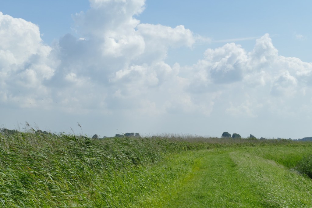We gaan in het hoge gras zitten in de flank van de dijk en eten een hapje. Daarna lopen we verder. Voor ons uit rent een eend op het pad. Het lijkt wel alsof ze voor ons op de vlucht is. Telkens als wij even stoppen om een foto te maken of ergens naar de kijken, vergroot de afstand tussen ons en Eend. Opvliegen doet ze niet… maar als we op een gegeven moment toch te dichtbij komen, fladdert Eend door het hoge gras de dijk af en zien we wat er aan de hand is: een gebroken vleugel… wegvliegen is er niet meer bij!