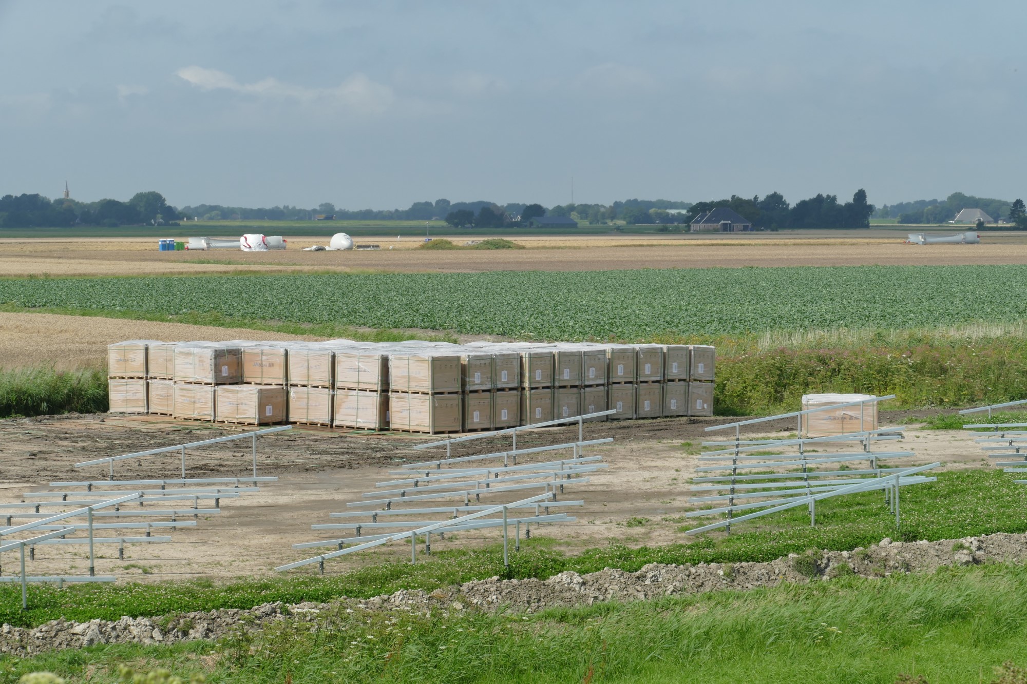 We verlaten de ‘jungle’, lopen onder het viaduct door en beklimmen de hoge, brede dijk die langs de Ringsloot ligt (vroeger dus de verlengde Langereis: het Waard-Groetkanaal). De ontwerper van deze Trage Tocht roemt het stuk over deze dijk, wij zijn er wat minder enthousiast over… Dat komt mede omdat het uitzicht naar links wordt bedorven door een zonnepanelenpark: parallel aan de vier kilometer lange dijk is men bezig een vier kilometer lange strook vol te zetten met zonnepanelen. Verderop in de polder worden nieuwe windmolens geplaatst… De Groetpolder als leverancier van groene energie! Nuttig, nodig, lelijk…