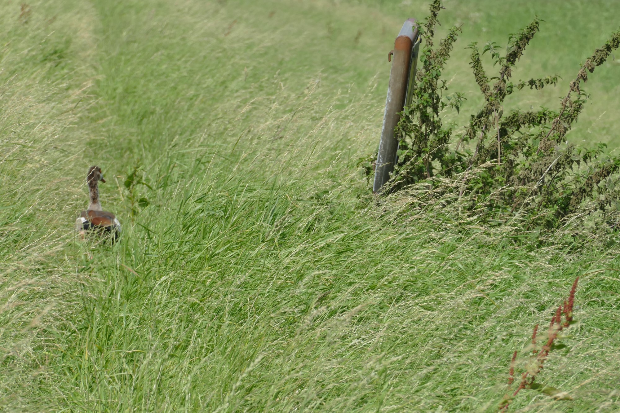 We gaan in het hoge gras zitten in de flank van de dijk en eten een hapje. Daarna lopen we verder. Voor ons uit rent een eend op het pad. Het lijkt wel alsof ze voor ons op de vlucht is. Telkens als wij even stoppen om een foto te maken of ergens naar de kijken, vergroot de afstand tussen ons en Eend. Opvliegen doet ze niet… maar als we op een gegeven moment toch te dichtbij komen, fladdert Eend door het hoge gras de dijk af en zien we wat er aan de hand is: een gebroken vleugel… wegvliegen is er niet meer bij!