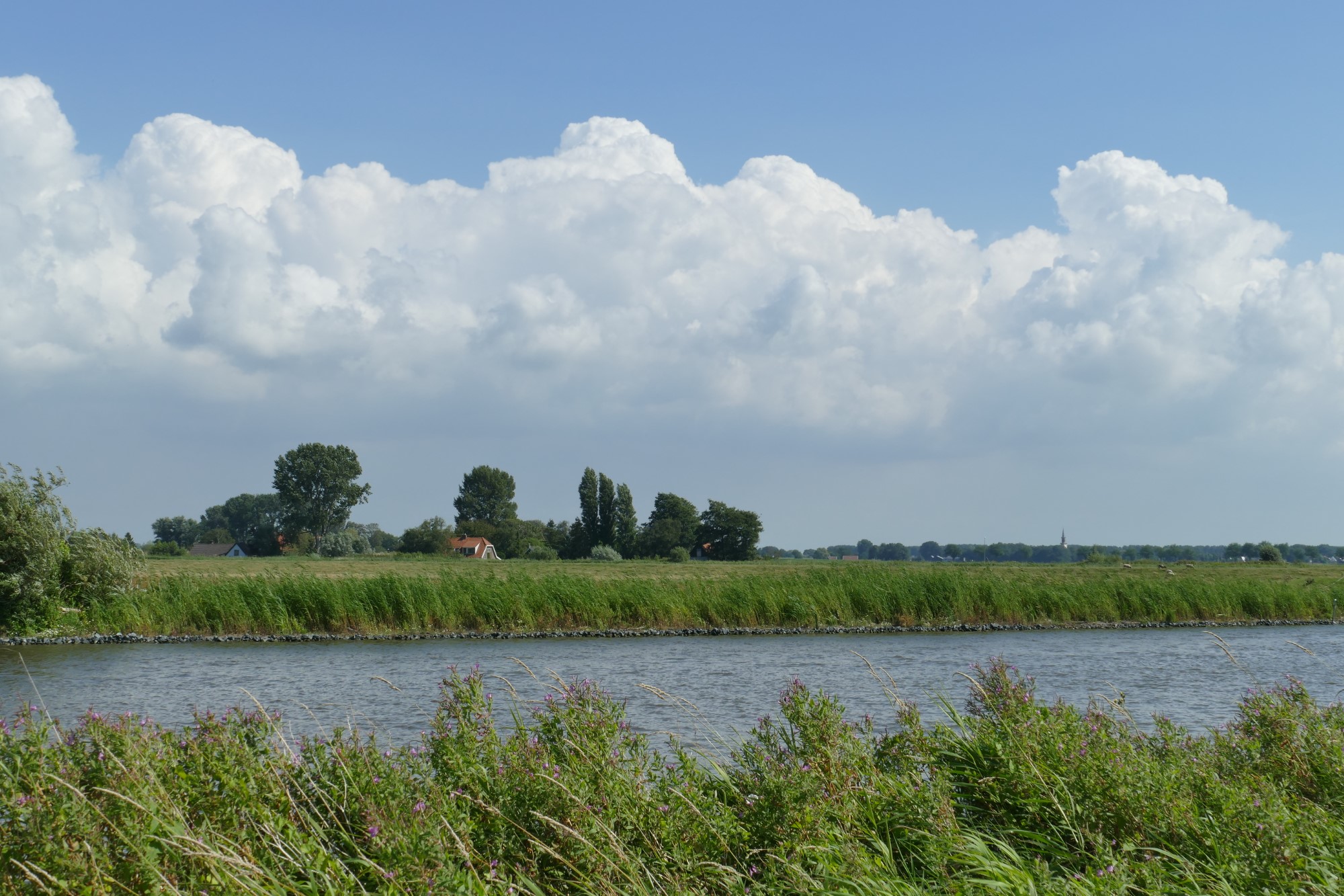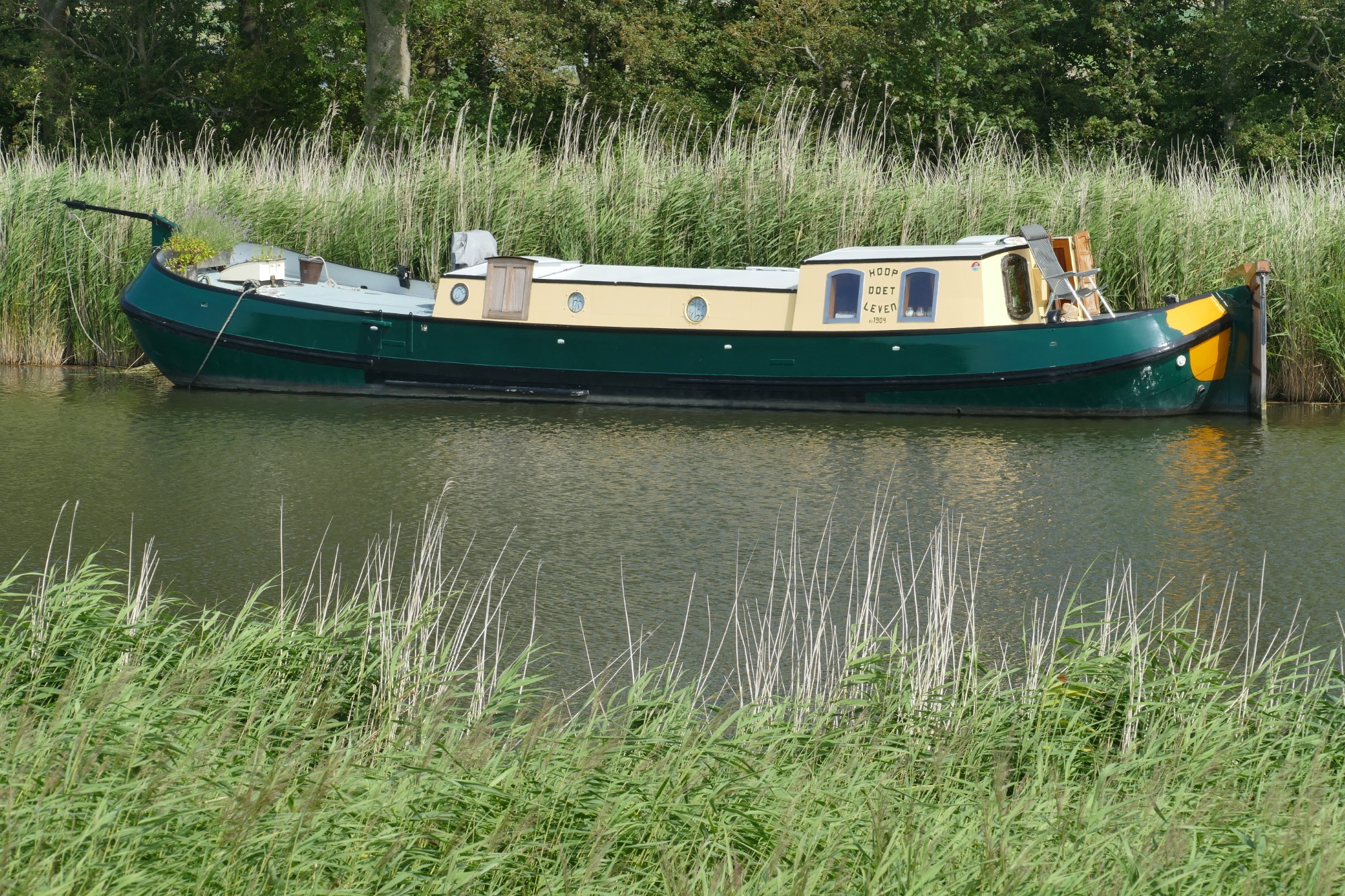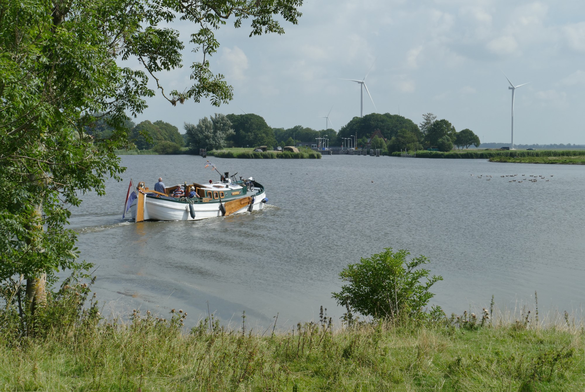 Aan de oever ligt de Hoop doet leven aangemeerd… een heerlijk stekje voorwaar! Wij zien de afstand tot de benzineopslagtanks van Avia Marees dichterbij komen. Daar maakt de dijk een haakse bocht en loopt verder langs breed, open water: het Kolhorner Diep. Rechts zien we de Westfriesche Sluis, die boten schut naar de erachter gelegen Westfriesche Vaart.