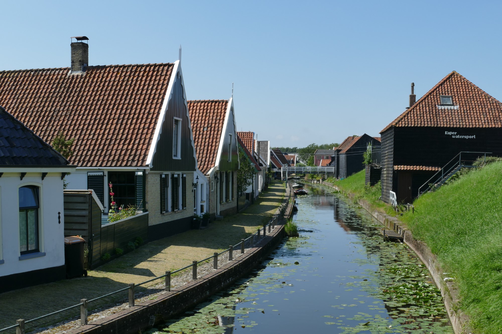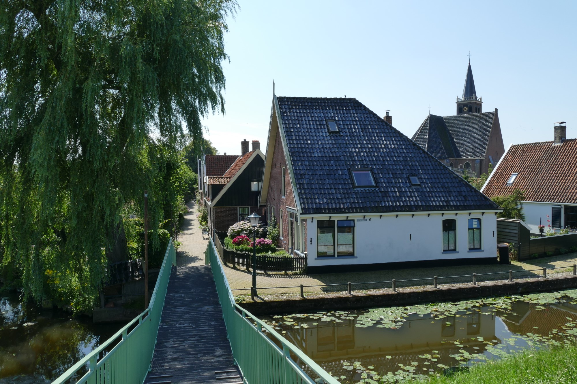 We naderen eindelijk Kolhorn, ooit een vissersdorp gelegen aan de Zuiderzee… nu ligt het 20 kilometer af van groot water. Op de dijk zie je nog een oude turfschuur (museum) en een paar vissersboetjes staan. Het dorp zelf ligt knus achter de hoge dijk en het loont zeker de moeite om de tijd te nemen om hier rond te kijken! Wij nemen echter eerst de tijd voor een terrasje… Een blondje van Affligem lest mijn dorst. Dan lopen we door tot bij de Turfschuur. Op de lantaarnpaal er tegenover laat een groot aantal routestickers zien dat je hier naar beneden moet, het bruggetje over en dan voort langs het water. Mooie huizen, mooie tuinen, een mooie kerk (17de eeuw) die helaas gesloten is zoals de meeste kerken en kerkjes in Noord-Holland….