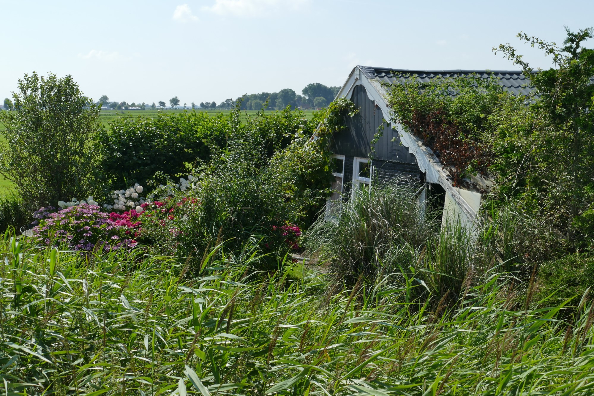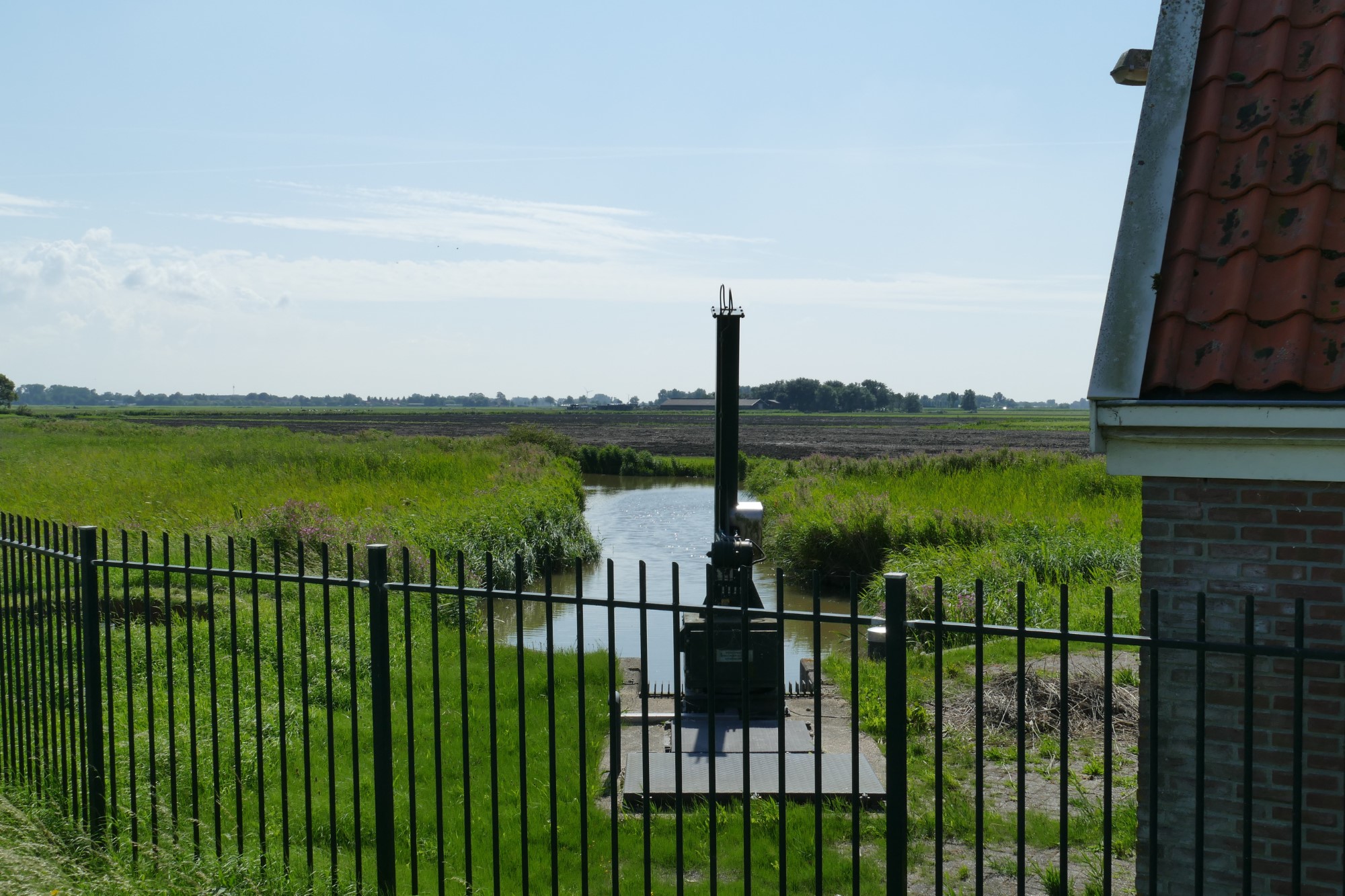 Aan de overkant van het water staan een paar rijen bomen. Tussen het groene loof schemert af en toe het rood van een pannendak. Die boerderijen staan langs de Groetweg, die ik bijna elke ochtend afreed op weg naar mijn schooltje in Slootdorp. Het is de rand van de enorme droogmakerij de Wieringermeer… Op een enkele plek kun je er een blik op werpen. Ook hier veel windmolens… Ik weet dat er over die windmolens het nodige is gezegd! Niet iedereen was/is er blij mee, maar ze staan er wel.