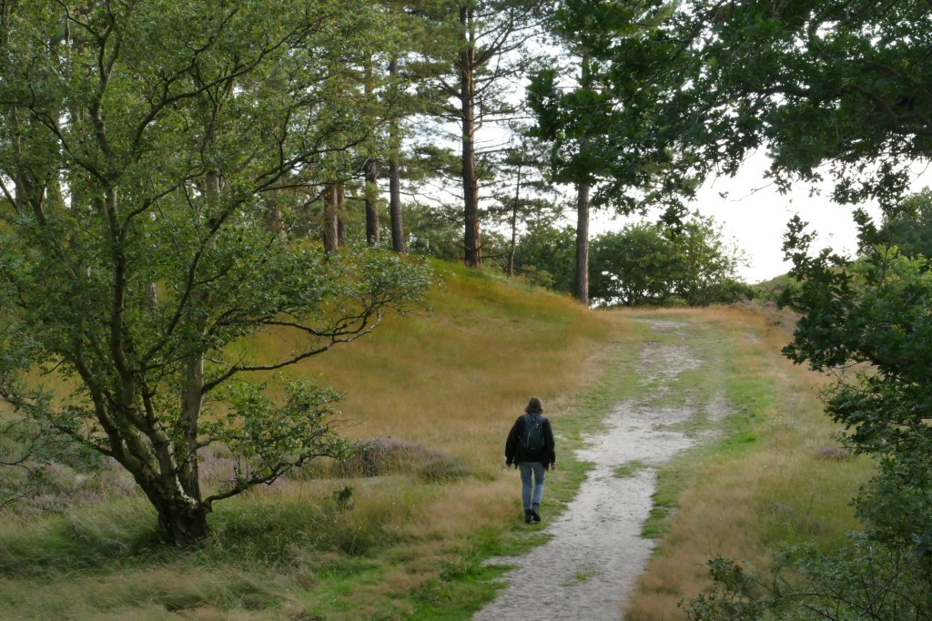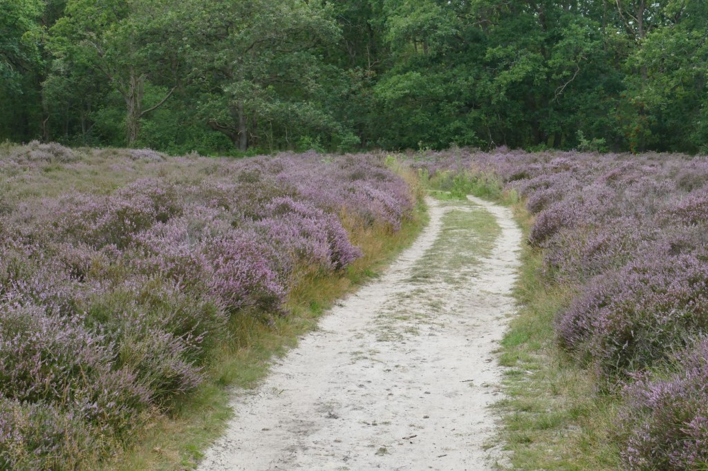We kiezen voor het pad dat enigszins parallel loopt aan de Zeeweg. Langs dat pad liggen kleinere, beschutte heideveldjes en we hopen dat die al volop in bloei staan. We hebben dat goed ingeschat…