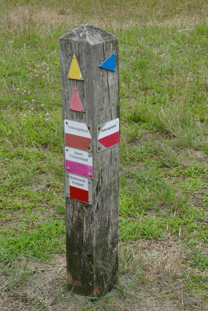 Tweemaal kruisen we een fietspad: eerst de Helmweg, daarna de Korteweg. Op die tweede kruising staat een wegwijzerpaaltje: drie LAW’s komen hier langs: het Trekvogelpad, het Groot Frieslandpad en het Nederlands Kustpad, plus nog een aantal lokale wandelingen. Een waar wandelknooppunt!