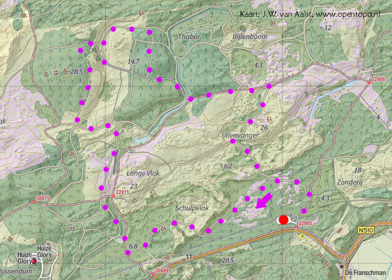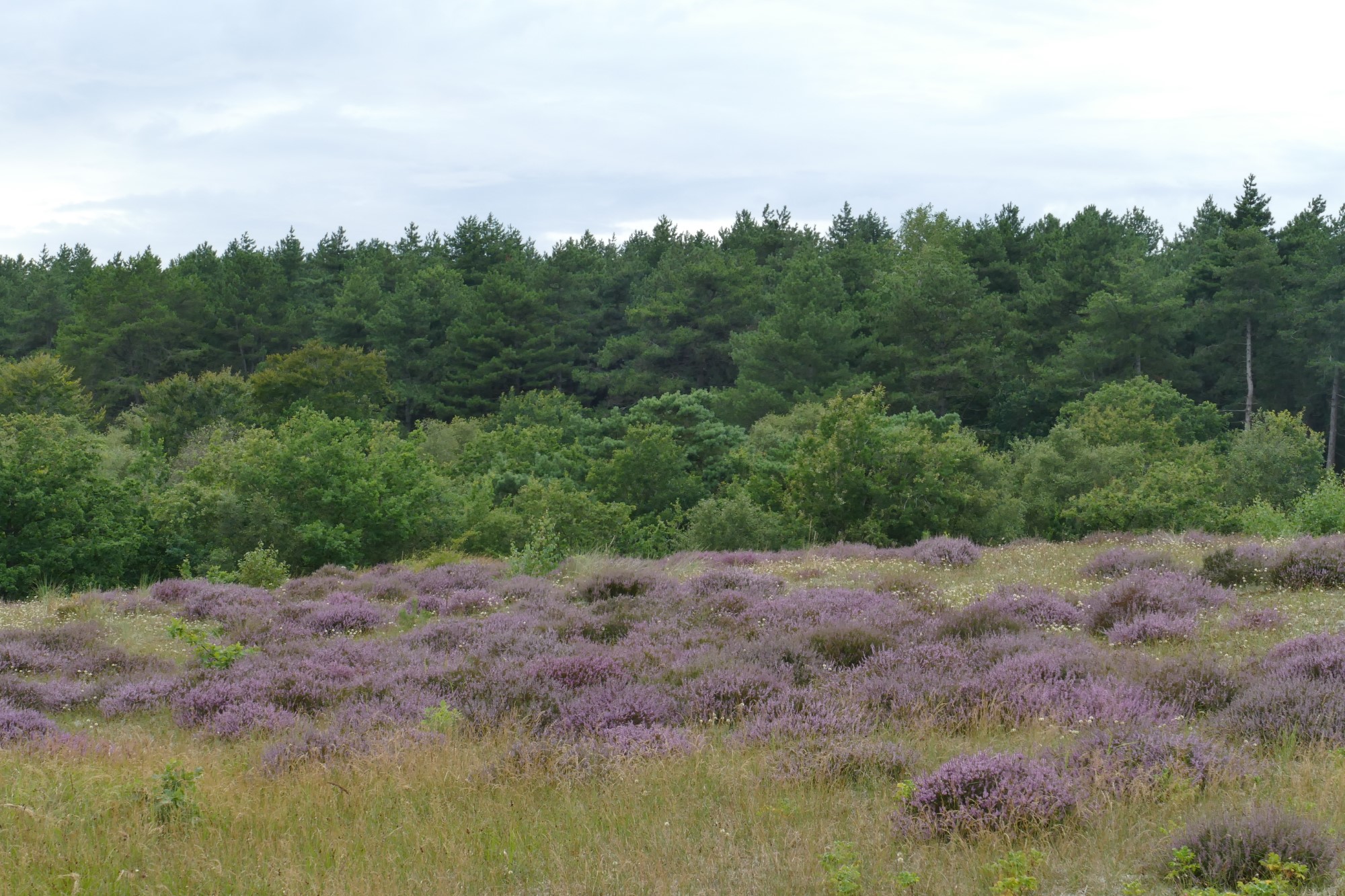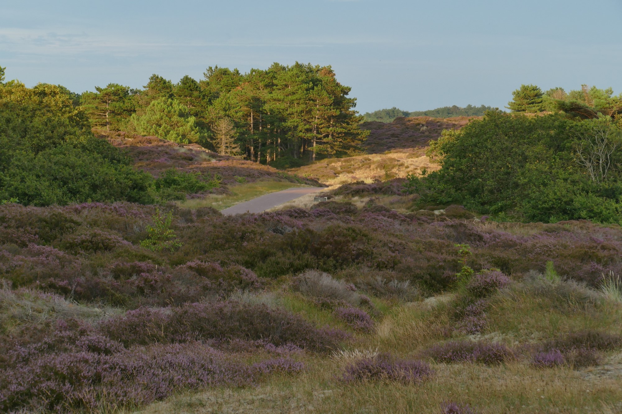 We kiezen voor het pad dat enigszins parallel loopt aan de Zeeweg. Langs dat pad liggen kleinere, beschutte heideveldjes en we hopen dat die al volop in bloei staan. We hebben dat goed ingeschat…
