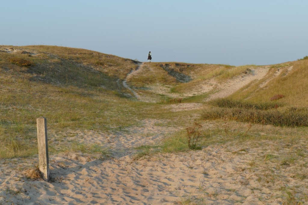We wandelen verder… Naarmate het einde van de dag nadert, kleurt het zonlicht oranje en wordt er een warme gloed over het duinlandschap gelegd…