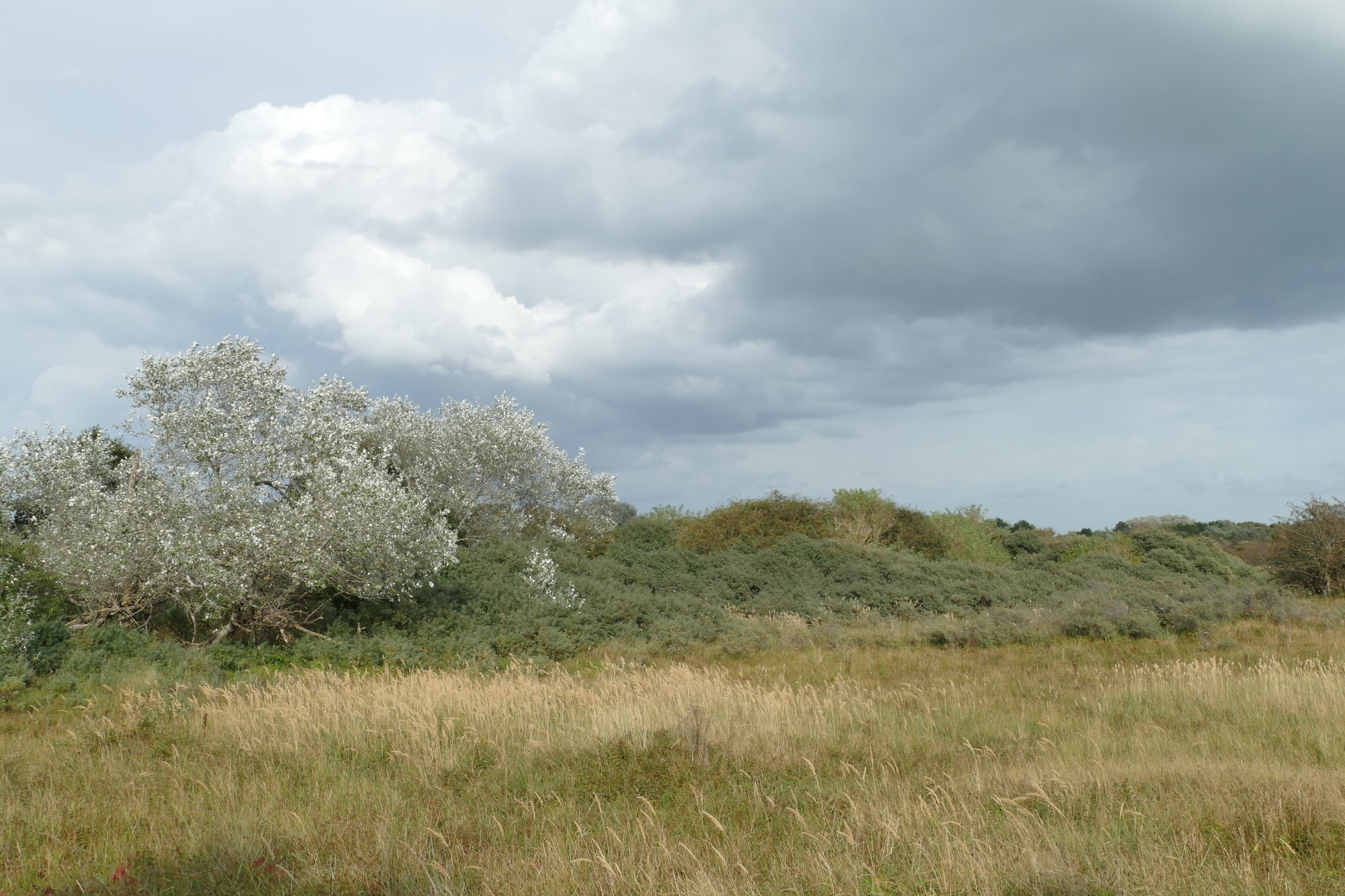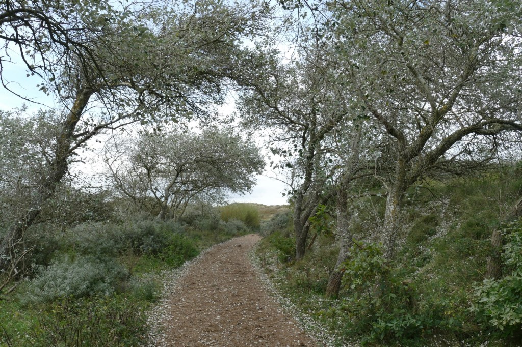 Naast het geel van de grassen, het grijsgroen van de duindoorn en het paars van de wolken, valt er nog een andere kleur op: het viltige wit van de blaadjes van de abelen: een van mijn lievelingsboomsoorten.