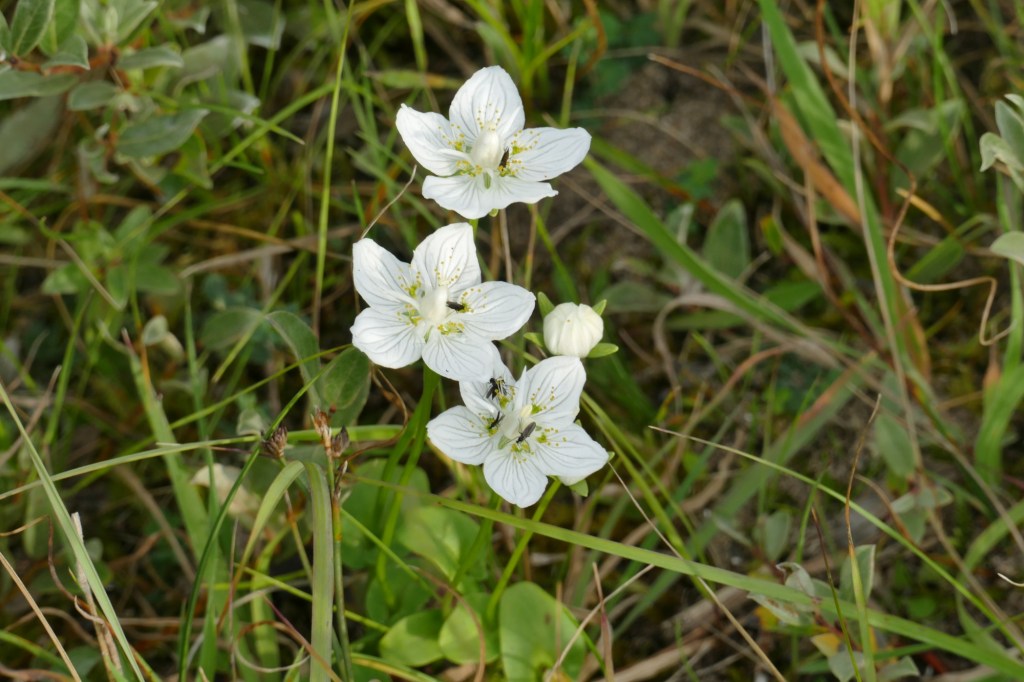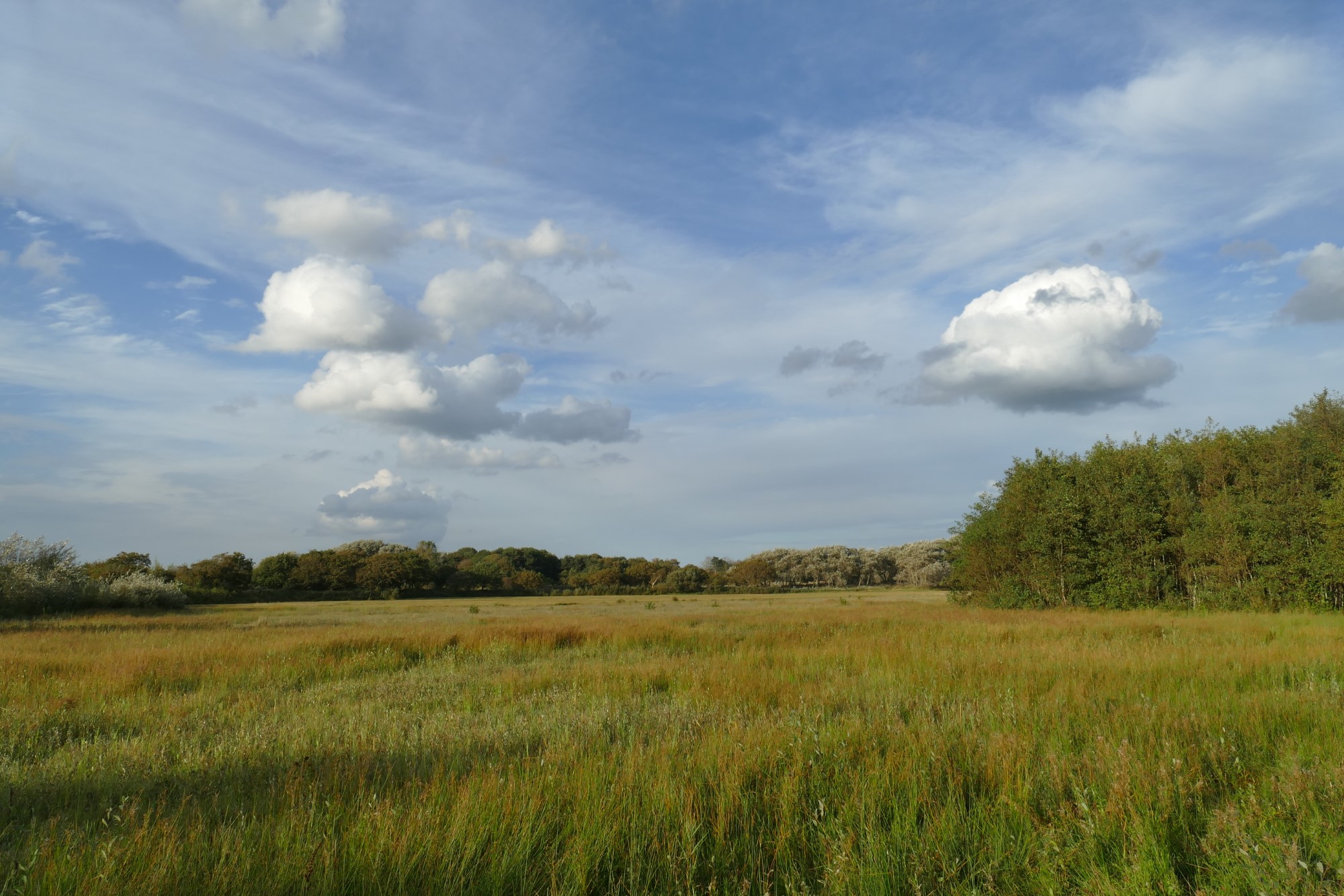Hoewel het een natte zomer is geweest, liggen veel landjes die in het voorjaar onder water staan, helemaal droog. Sterker: ze zijn gemaaid en het maaisel is gebruikt om de zanderige paden te bedekken, wat aangenamer loopt dan baggeren door mul zand! Ook de grote plas achter het Liobaklooster ligt droog; grotendeels droog, moet ik zeggen. De lila watermunt en de paarsroze kaarsen van de kattenstaart zijn verdord en kleuren de plas roestbruin.