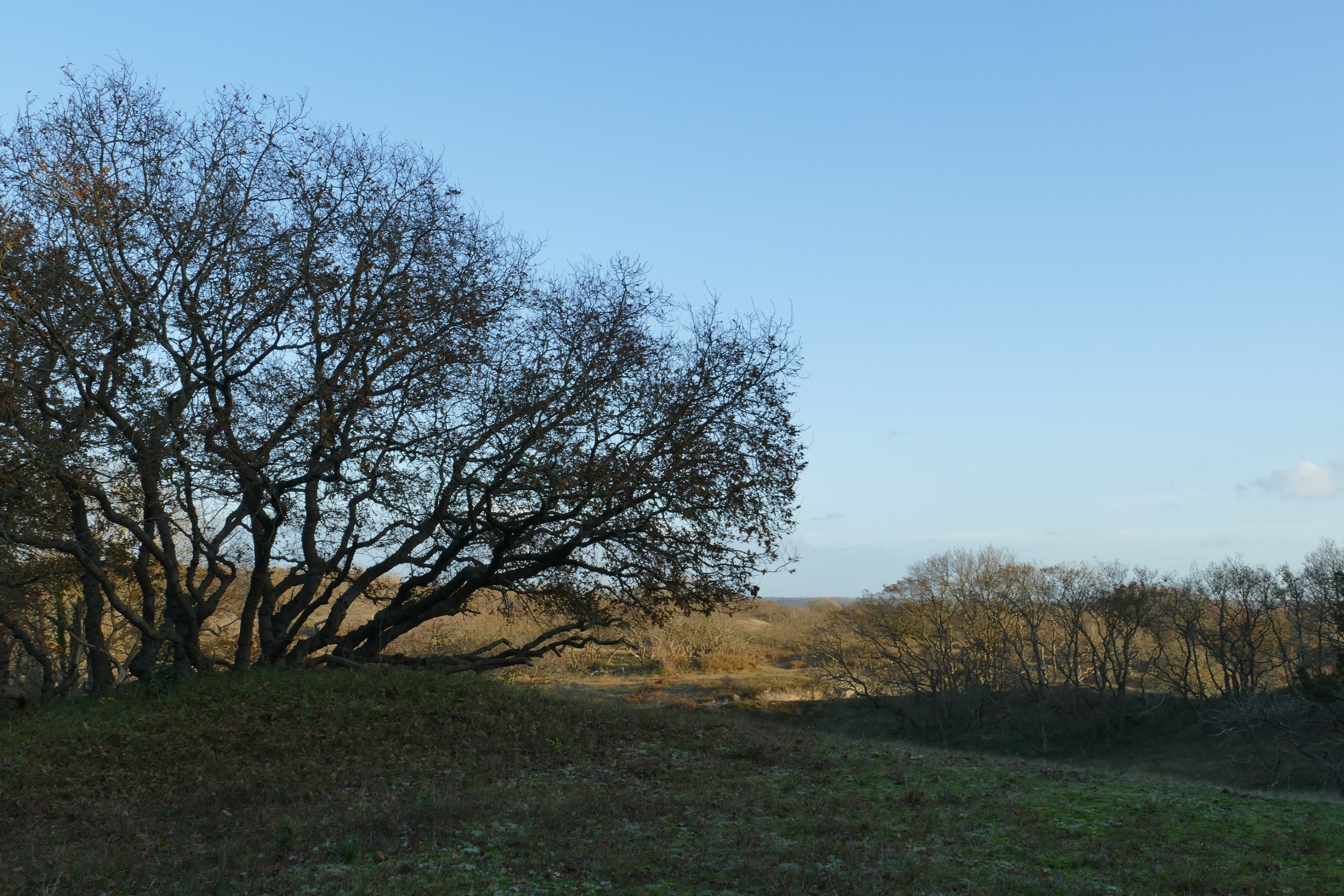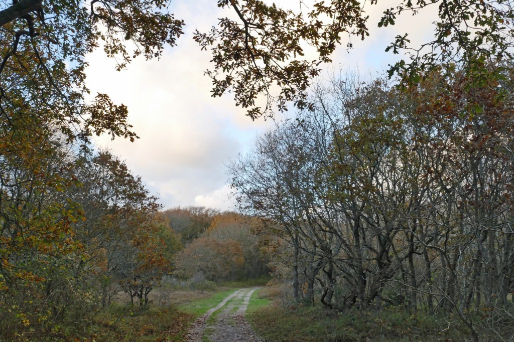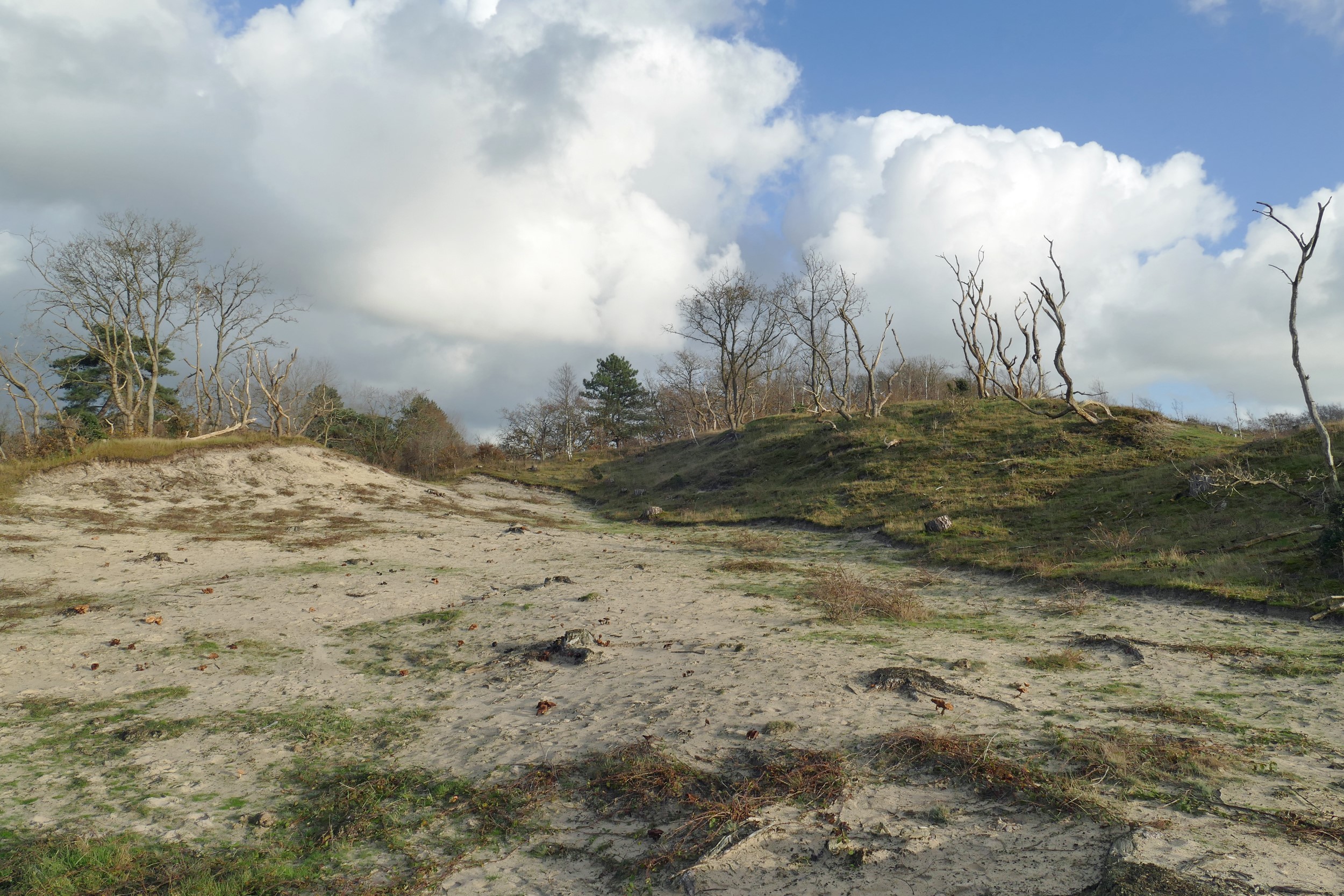 Het is al bijna half drie als we aan onze wandeling beginnen. Er drijven een paar flinken wolkenpartijen over, maar gelukkig klaart de lucht daarna helemaal op en overheerst het blauw… Het oostelijk pad langs de Verbrande Pan kennen we van lang geleden en het valt ons niet tegen: het slingert vrolijk door bos, heide en open duin en is heel afwisselend!